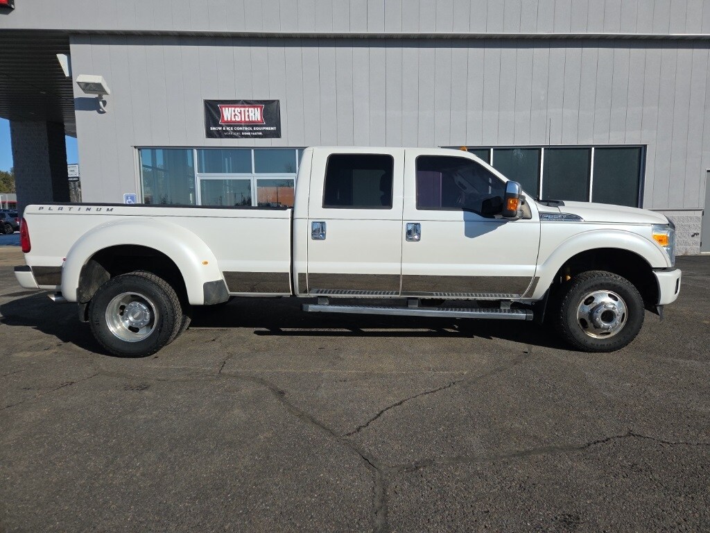 White 2013 Ford F-350SD Lariat DRW 4WD TorqShift 6-Speed Automatic with Overdrive 6.2L V8 EFI SOHC 16V Flex Fuel 4X4, Navigation, Leather Seats, Power Seat, Dual Climate Control, Alloy Wheels, Remote Start, Cruise Control, BlueTooth Compatible, Reverse Back up Camera, 4WD, 6" Angular Chrome Step Bars, ABS brakes, Body-Color Front & Rear Bumpers, Bright Chrome Door & Tailgate Handles, Chrome Exhaust Tip, Chrome Skull Caps on PowerScope Mirrors, Console, Door Trim, GVWR: 14,000 lb Payload Package, Memory Power Adjustable Pedals, Navigation System, Navigation System w/HD & Satellite Broadcast, Platinum Package, PowerScope Trailer-Tow Mirrors, Premium Leather-Wrapped/Wood Steering Wheel, Remote Start System, Tailgate Step & Handle, Traction control, Unique Platinum Leather 40/Console/40 Seats, Unique Satin Chrome Grille, Universal Garage Door Opener. Recent Arrival!