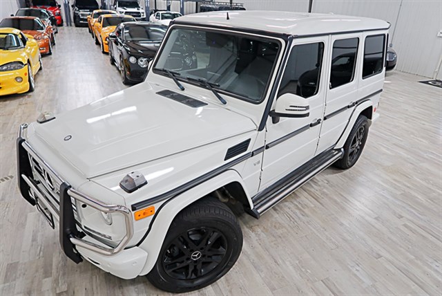 This 2013 Mercedes-Benz G-Class G550 4MATIC features a clean Carfax and is finished in Arctic White with a black interior. It is equipped with a powerful AMG 5.5L V8 engine and a 7-speed automatic transmission. The vehicle offers luxury features like leather and wood trimmed interior, blind spot assist, and a moon roof.