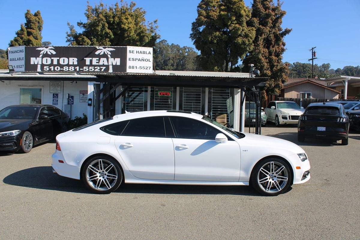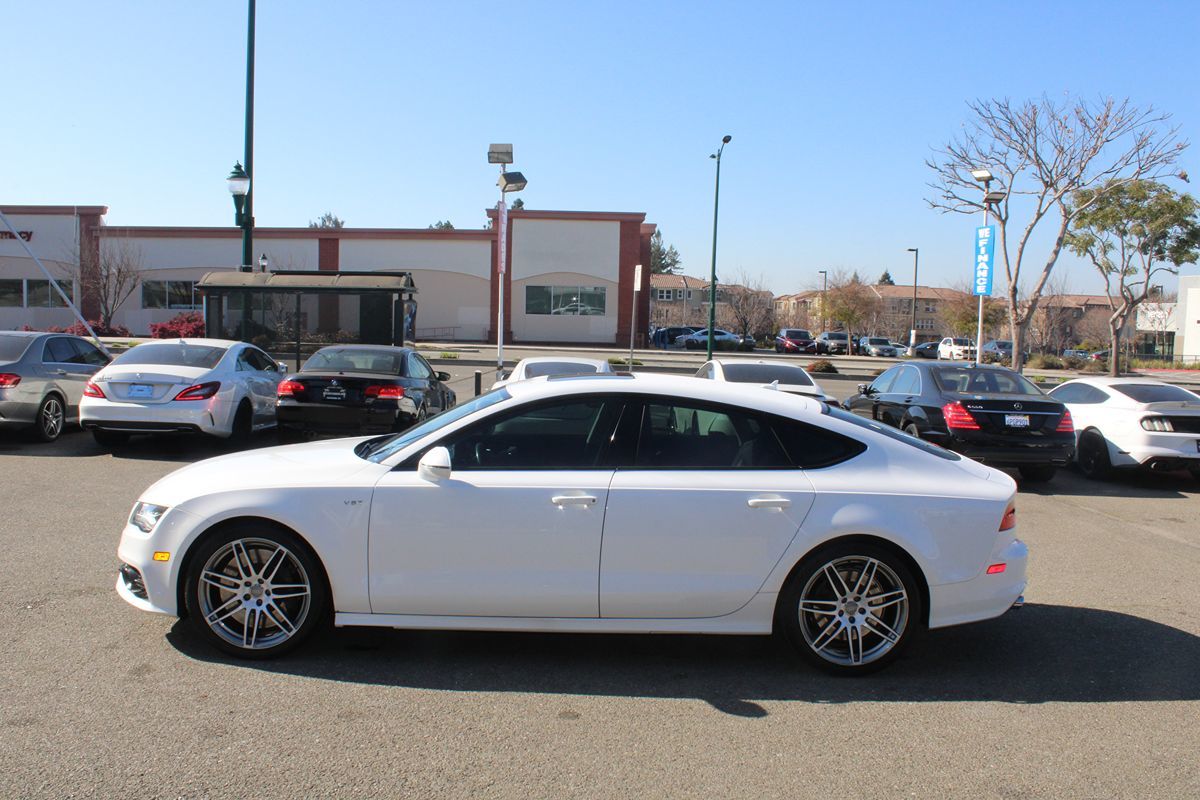 The 2014 Audi S7 4dr HB Prestige in Ibis White exudes a sleek and sophisticated presence, turning heads with its dynamic design and refined elegance. This luxurious sports hatchback marries the distinguished aesthetics of Audi's design philosophy with the versatile functionality of a hatchback, offering a seamless blend of performance and practicality. Its striking exterior is complemented by a meticulously crafted interior, finished in a rich black color scheme that enhances the vehicle's plush and sporty ambiance. Under the hood, the heart of the S7 lies in its powerful 4.0L 8-cylinder engine, delivering an exhilarating driving experience that combines raw power and efficiency. The performance is further amplified by an advanced All Wheel Drive system, ensuring optimal traction and stability across diverse driving conditions. The engine's prowess is seamlessly harnessed through a sophisticated transmission system, providing a smooth yet thrilling ride that caters to both spirited drives and everyday commutes. Inside, the Prestige trim level enriches the driving experience with premium features and cutting-edge technology. The cabin is adorned with top-tier materials and boasts a suite of innovative amenities, designed to cater to the needs of discerning drivers and passengers alike. The vehicle's ergonomically designed seats offer exceptional comfort, while the intuitive interface allows for effortless control of the vehicle's numerous features. This Audi S7 is not just about performance, but also about providing an environment where luxury meets functional elegance.