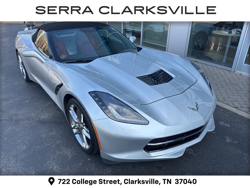 Blade Silver Metallic 2014 Chevrolet Corvette Stingray Z51 2LT. The Pre-Owned 2014 Chevrolet Corvette Stingray Z51 with 6.2L V8 at Serra Clarksville. Well equipped: Battery Protection Package, Memory Package, Preferred Equipment Group 2LT (2LT Interior Trim, Auto-Dimming Inside Frameless Rearview Mirror, Body-Color Outside Heated Power-Adjustable Mirrors, Cargo Net, Head-Up Head-Up-Display, Heated & Vented Driver & Passenger Seats, Power Lumbar/Bolster Seat Adjusters, Radio: Chevrolet MyLink AM/FM Stereo, Theft Deterrent System, and Universal Home Remote), 2.73 Limited Slip Performance Rear Axle Ratio, 4-Wheel Disc Brakes, 8-Way Driver & Passenger Seat Adjusters, 9 Speakers, ABS brakes, Air Conditioning, Alloy wheels, AM/FM radio: SiriusXM, Automatic temperature control, Bose Premium 9-Speaker Audio System Feature, Bumpers: body-color, Compass, Convertible roof lining, Delay-off headlights, Driver door bin, Driver vanity mirror, Dual front impact airbags, Dual front side impact airbags, Electronic Stability Control, Emergency communication system: OnStar Directions & Connections, Exterior Parking Camera Rear, Four wheel independent suspension, Front anti-roll bar, Front Bucket Seats, Front Center Armrest, Front dual zone A/C, Front License Plate Bracket, Front reading lights, Fully automatic headlights, Glass rear window, GT Bucket Seats, Heated door mirrors, High-Intensity Discharge Headlights, Illuminated entry, Leather Shift Knob, Leather steering wheel, Low tire pressure warning, Mulan Perforated Leather Seating Surfaces, Navigation System, Occupant sensing airbag, Outside temperature display, Panic alarm, Passenger door bin, Passenger vanity mirror, Performance Exhaust, Power convertible roof, Power door mirrors, Power driver seat, Power passenger seat, Power steering, Power windows, Premium audio system: Chevrolet MyLink, Radio data system, Rear anti-roll bar, Rear window defroster, Red Painted Calipers, Remote keyless entry, Remote Vehicle Starter System, SiriusXM Satellite Radio, Speed control, Speed-sensing steering, Spoiler, Sport steering wheel, Steering wheel mounted audio controls, Tachometer, Telescoping steering wheel, Tilt steering wheel, Traction control, Trip computer, Variably intermittent wipers, Voltmeter.