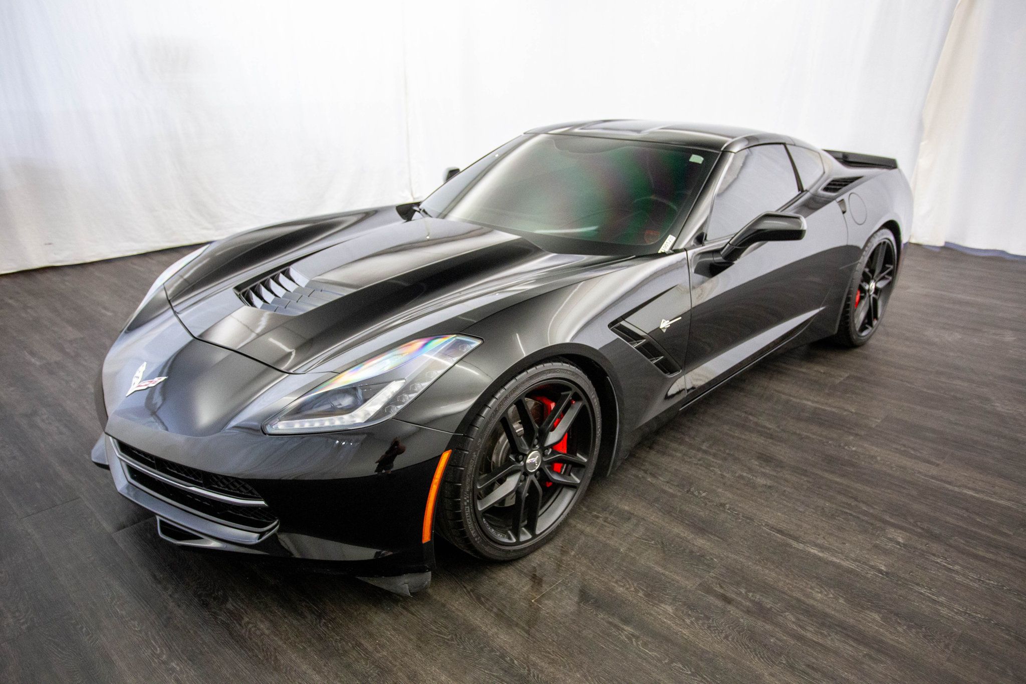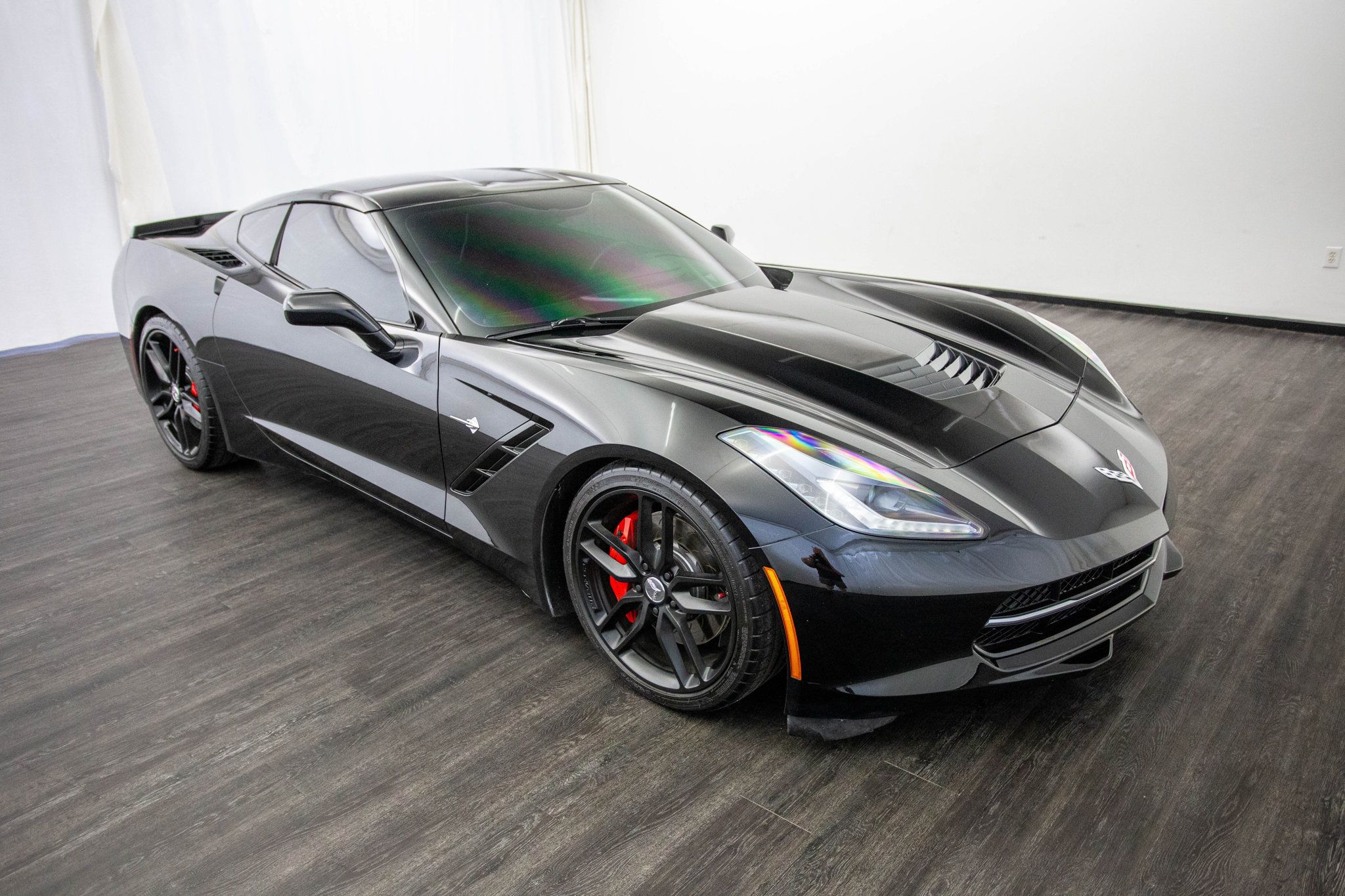 2014 Chevrolet Corvette Stingray 2dr Z51 Coupe w/3LT. Southern owned and tastefully upgraded, this Corvette Stingray with 3LT is a true performance machine with the looks to match. Dressed in a menacing Black exterior over a Jet Black leather interior, this Stingray is powered by a 6.2L V8 engine paired to a thrilling 7-speed manual transmission, delivering raw American muscle right to your fingertips. Equipped with custom long tube headers and a custom catch can, this Corvette offers an aggressive tone and enhanced performance. The Z51 Performance Package adds upgraded brakes, suspension, and cooling, making this Stingray track-ready and street-dominant. It rides on staggered factory aluminum wheels wrapped in Michelin tires for confident grip and stance. Inside, enjoy premium comfort and cutting-edge tech with the 3LT package, including an 8" color touchscreen with navigation and backup camera, heads-up display, Bose audio system, and an aftermarket carbon fiber steering wheel that adds a race-inspired feel every time you take control. Whether you're carving through corners or cruising the highway, this C7 delivers a first-class driving experience from every angle. Get behind the wheel of this blacked-out beast, available now at Cosmo Motors!