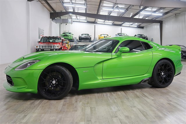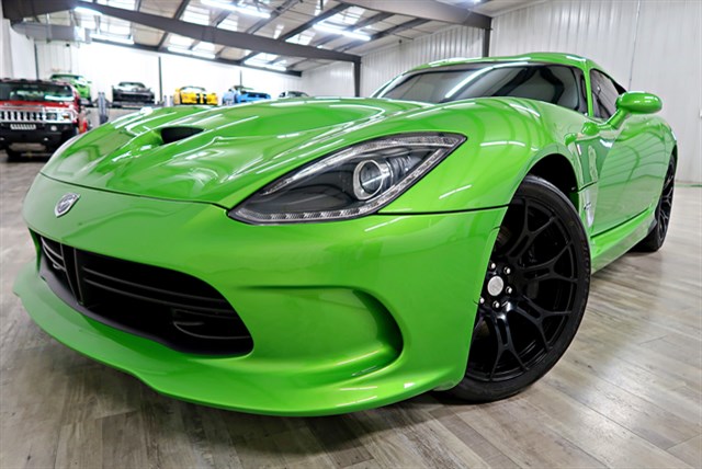 2014 Dodge Viper SRT-10 in Stryker Green with a clean Carfax and only 14K miles. Features a 6-speed manual transmission and a 8.4L V10 engine. Includes premium options like Sabelt leather seats and a GTS hood.