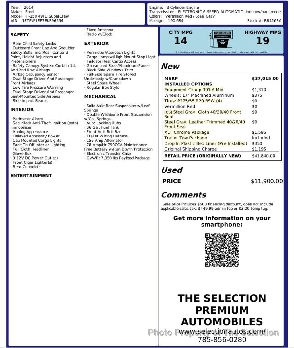 This 2014 Ford F-150 XLT SuperCab 4WD has been recently serviced, receiving a oil change, filter, and fluids topped. We also replaced the water pump, thermostat assembly, upper radiator hose, heater hose, HVAC vent repairs, installed an air shock kit, and two new tires. It is powered by a 5.0L V8 engine paired with a 6-speed automatic transmission and four-wheel drive. This F-150 is equipped with the XLT Trim and the XLT Chrome Package, featuring chrome front tow hooks, chrome bar-style grille insert, chrome exhaust tip, chrome running boards, chrome door handles with black bezels, and 18-inch chrome-clad aluminum wheels, along with the Trailer Tow Package and the 301A Equipment Group Mid. We offer to finance all and welcome trade-ins. Thank you for taking the time to review our listings.