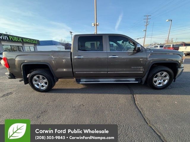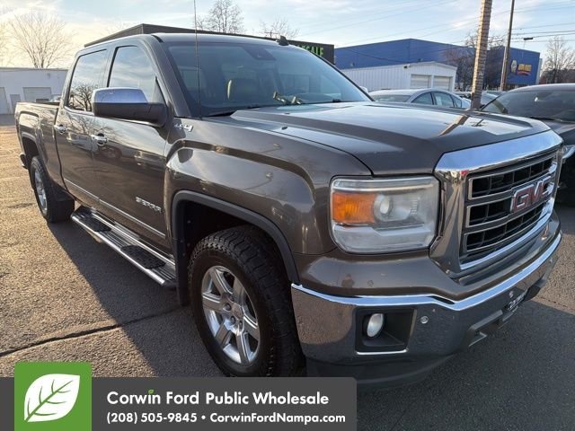 Our 2014 GMC Sierra 1500 SLT Crew Cab 4X4, shown in a rugged and beautiful Quicksilver, will exceed your expectations. Powered by a 5.3 Liter V8 securing 355hp paired to a 6 Speed Automatic transmission for easy passing. This stellar Four Wheel Drive scores up to 22mpg on the highway and offers coil-over-shock front independent suspension for an outstanding, comfortable work machine. Our SLT is enhanced by chrome trim, running boards, a spray-on bedliner, and 18-inch alloy wheels. Within our SLT, indulgent seating with upscale elements typically found in high-end luxury trucks is ready for you. Enjoy the technological goodies; the impressive sound system and dual-zone automatic climate control add to the prestige of this upscale truck. The well-known GM safety features are in place to protect you, your family, and your cargo. StabiliTrak, ABS, daytime running lamps, and numerous airbags share a common goal: to ensure your safety. This Sierra 1500 SLT works hard to support your lifestyle. Save this Page and Call for Availability. We Know You Will Enjoy Your Test Drive Towards Ownership! Corwin Ford Nampa! Friendly service and aggressive pricing is why we are your new and pre-owned vehicle dealer serving, Nampa, Boise, Meridian, Caldwell, Kuna, Eagle, Emmett, Idaho City, Wilder, New Plymouth, Star, Middleton, Weiser, Payette, Horseshoe Bend, Mountain Home, Idaho, and surrounding states.