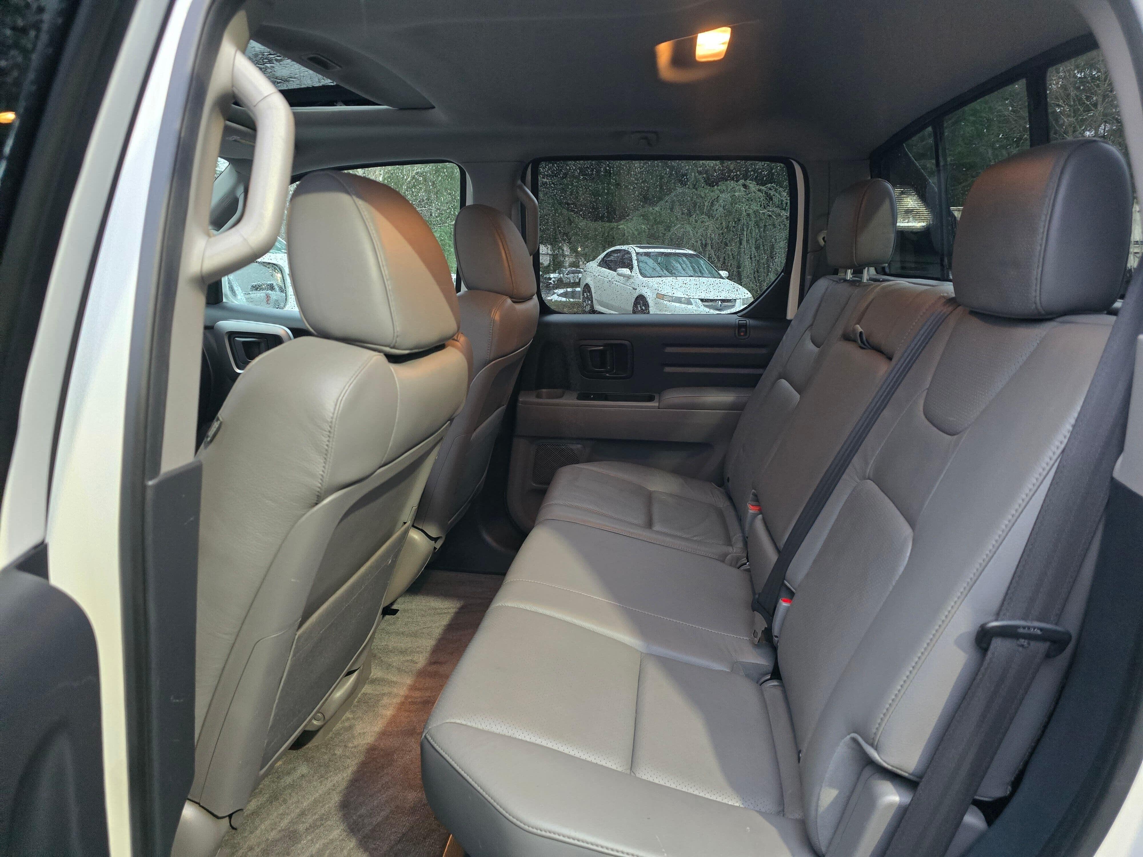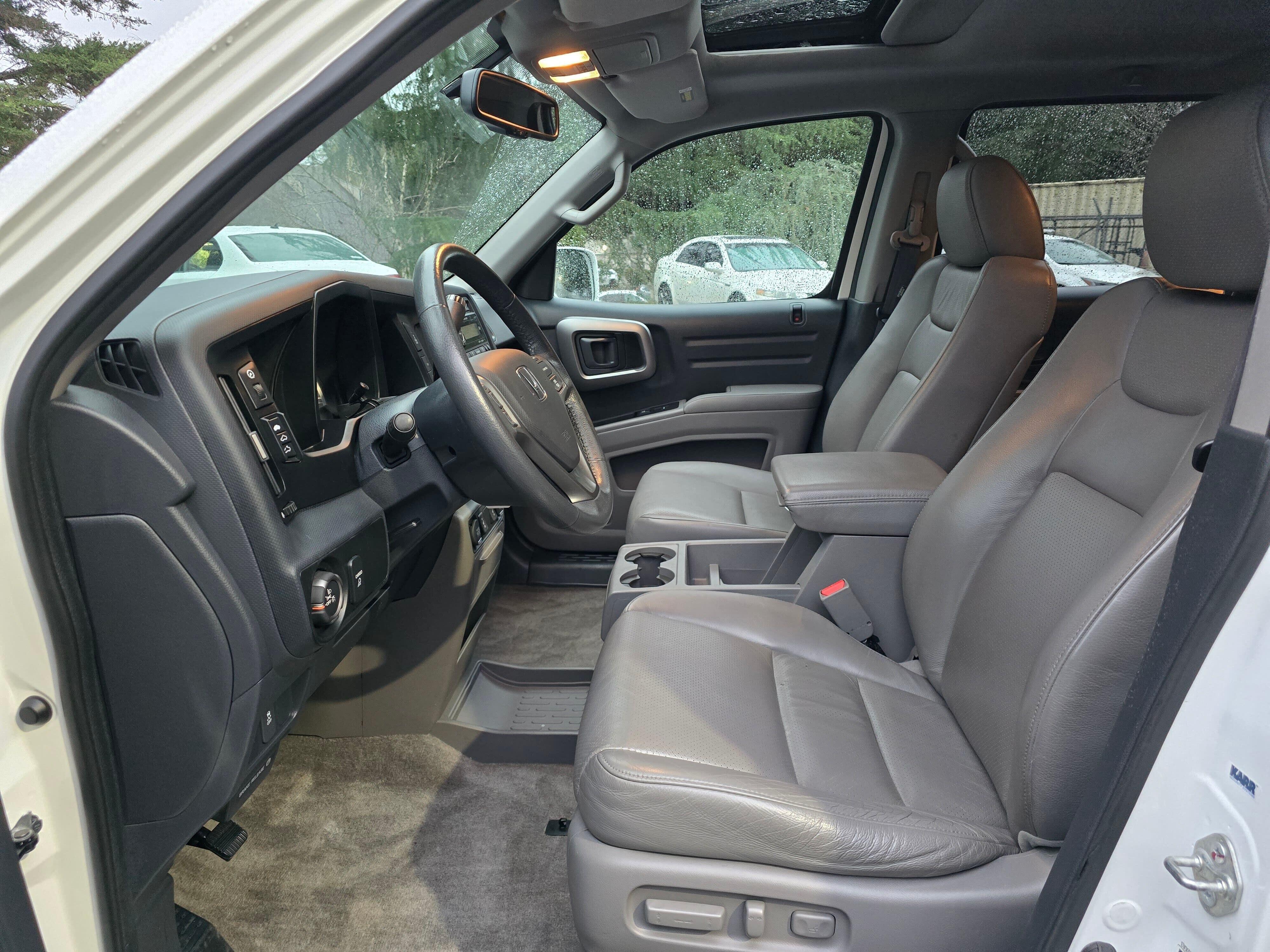 Extra extra clean low mileage 2014 Honda Ridgeline RTL White RTL 4WD 5-Speed Automatic 3.5L V6 SOHC VTEC 24V. Leather, 4-Wheel Disc Brakes, 4.53 Axle Ratio, 7 Speakers, ABS brakes, Air Conditioning, Alloy wheels, AM/FM radio: XM, AM/FM/6-Disc In-Dash Audio System, Anti-whiplash front head restraints, Automatic temperature control, Brake assist, Bumpers: body-color, CD player, Compass, Driver door bin, Driver vanity mirror, Dual front impact airbags, Dual front side impact airbags, Electronic Stability Control, Exterior Parking Camera Rear, Four wheel independent suspension, Front anti-roll bar, Front Bucket Seats, Front Center Armrest w/Storage, Front dual zone A/C, Front fog lights, Front reading lights, Garage door transmitter: HomeLink, Heated door mirrors, Heated Front Bucket Seats, Heated front seats, Illuminated entry, Leather Seat Trim, Low tire pressure warning, Occupant sensing airbag, Outside temperature display, Overhead airbag, Overhead console, Panic alarm, Passenger door bin, Passenger vanity mirror, Power door mirrors, Power driver seat, Power moonroof, Power steering, Power windows, Rear anti-roll bar, Rear reading lights, Rear seat center armrest, Rear step bumper, Remote keyless entry, Security system, Speed control, Speed-sensing steering, Split folding rear seat, Steering wheel mounted audio controls, Tachometer, Tilt steering wheel, Traction control, Trip computer, Variably intermittent wipers, Wheels: 18" Machine-Finished Silver Alloy, XM Radio. Leather. Odometer is 28370 miles below market average!