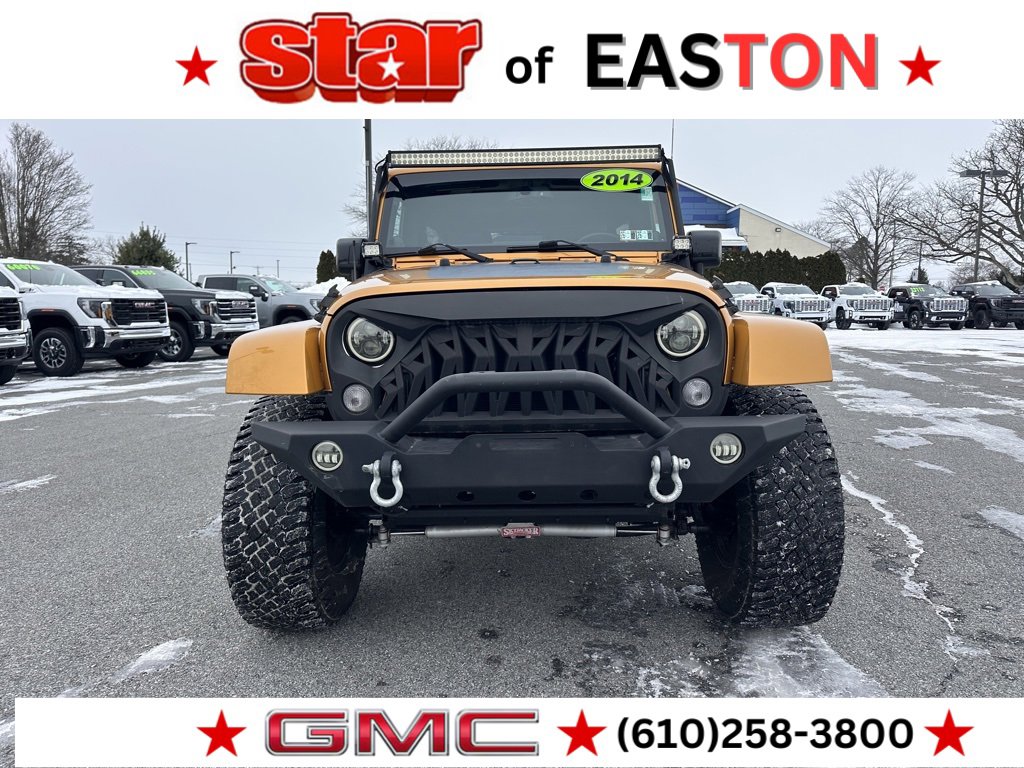 FREE Carfax report available, go to www.stargmc.com or call 610-258-3800, local trade in, navigation, leather, Bluetooth, USB port, satellite radio, heated seats, remote keyless entry, remote start, heated steering wheel, Altitude Hood Decal, Body Color 3-Piece Hard Top, Connectivity Group, Jeep Wrangler Altitude Edition, Max Tow Package, Quick Order Package 24L Altitude, Steering wheel mounted audio controls, Trailer Tow w/4-Pin Connector Wiring. 2014 Jeep Wrangler Unlimited Altitude 3.6L V6 24V VVT 4D Sport Utility 5-Speed Automatic Orange. Lehigh Valley's Largest GM Dealer! Star is a family owned and operated dealership that has been serving our area for over 54 years. With 2 locations we have over 600 cars to choose from! StarMC.com / Contact us at 610-258-3800.