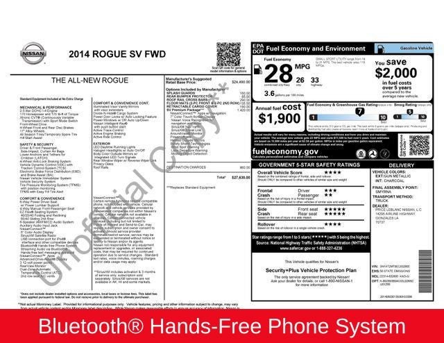 Discover the perfect blend of style, technology, and versatility in this 2014 Nissan Rogue SV. This exceptional crossover SUV offers a remarkable combination of features and capabilities that are sure to impress. With its sleek exterior design and spacious, well-appointed interior, the Rogue SV provides the perfect blend of style and functionality. The 2.5L I4 DOHC 16V engine, paired with the efficient CVT with Xtronic, delivers an impressive 26 city/33 highway MPG, ensuring you can go farther on every tank. The SV Premium Package elevates your driving experience with a host of advanced features. Safety is a top priority in the Rogue SV, with the Safety Shield Technologies suite including blind spot warning, lane-departure warning, and moving object detection. Stay connected with the NissanConnect infotainment system, featuring a 7-inch color touch-screen display, navigation, and voice recognition. Comfort and convenience are assured with features like dual-zone automatic climate control, power driver's seat, and steering wheel-mounted audio controls. The Rogue SV's versatile seating and cargo configurations make it the perfect companion for your everyday adventures and weekend getaways. This 2014 Nissan Rogue SV is a truly exceptional value, offering a wealth of premium features and capabilities at an incredibly competitive price. Experience the difference for yourself and schedule a test drive today. We're confident you'll be impressed by the Rogue's exceptional blend of style, technology, and practicality.