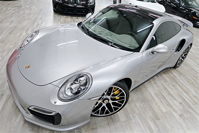2014 Porsche 911 Turbo S with a clean Carfax and only 8,995 miles. Features a GT Silver metallic exterior and Platinum Grey interior. This vehicle has an MSRP over $200K.