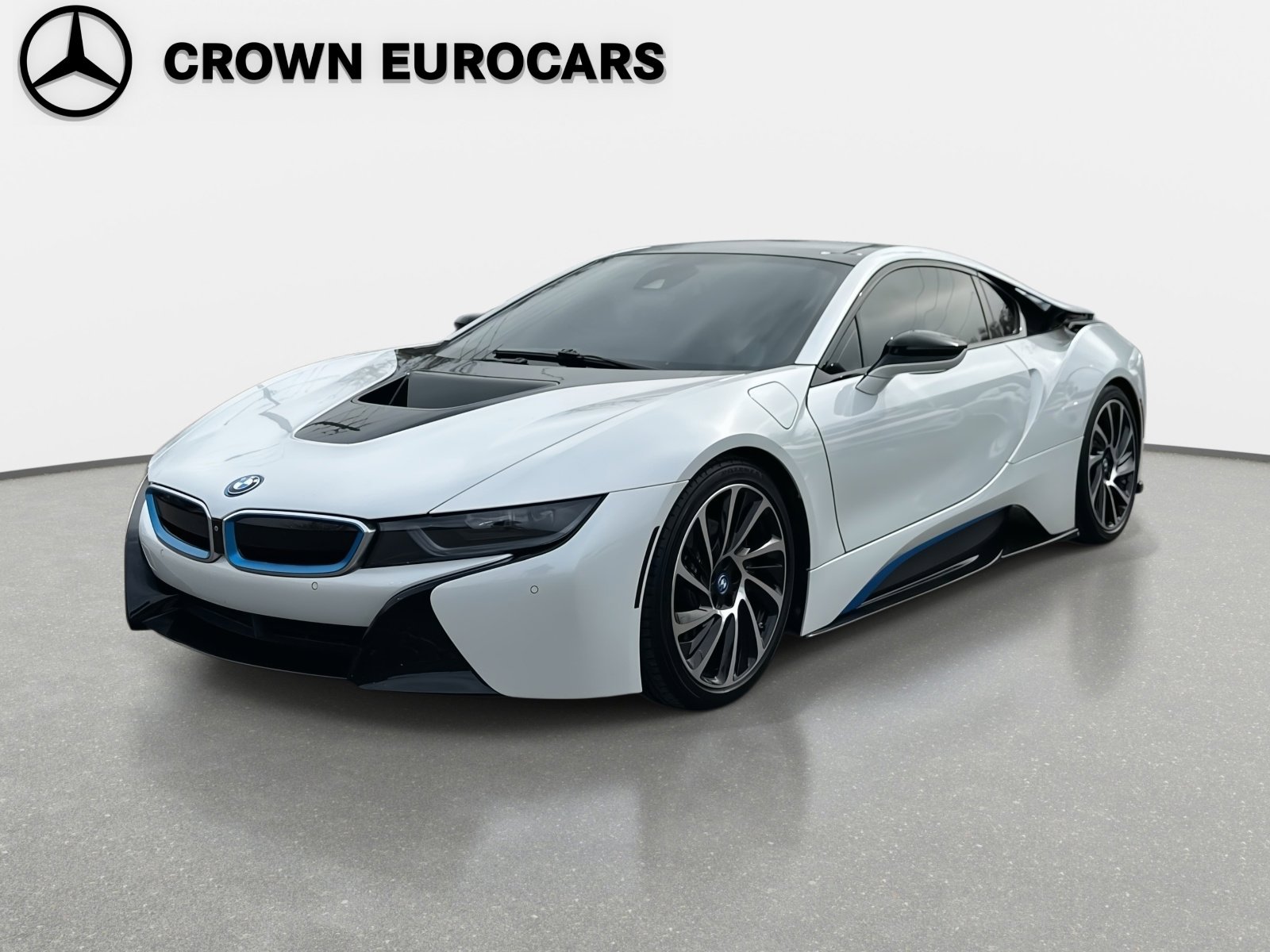 This 2015 BMW i8 shows 27,501 miles, carries a clean Carfax, is equipped with a Maxton Design body kit, and had a total MSRP of $150,095 when new. Finished in Crystal White Pearl Metallic with BMW i Frozen Blue accents over a Pure Impulse Carum Spice interior, the i8 remains one of BMW's most distinctive and forward-thinking performance cars, blending futuristic design with plug-in hybrid technology. Power comes from a turbocharged 1.5-liter three-cylinder engine paired with an electric motor and a 6-speed automatic transmission, delivering all-wheel drive performance through BMW's lightweight carbon-fiber-reinforced plastic and aluminum architecture. The Maxton Design body kit adds a more aggressive visual presence while complementing the i8's factory aerodynamic styling. Additional standard and included equipment consists of LED headlights, aluminum wheels with painted accents, active suspension, navigation system, heads-up display, premium sound system, keyless start, dual-zone automatic climate control, backup camera, parking sensors, and a comprehensive suite of safety and driver-assistance features. With its clean history, modest mileage, rare color combination, and tasteful exterior upgrades, this BMW i8 stands as a compelling example of BMW's landmark hybrid sports car, offering striking design, innovative engineering, and everyday usability in one unmistakable package.