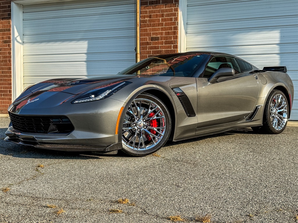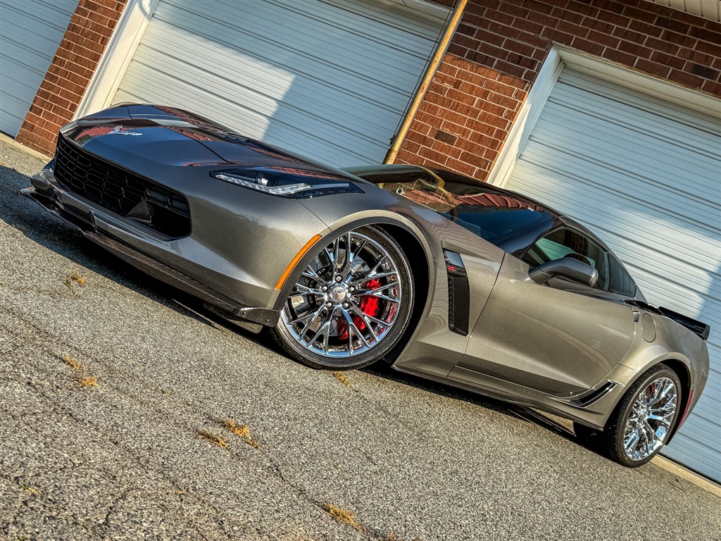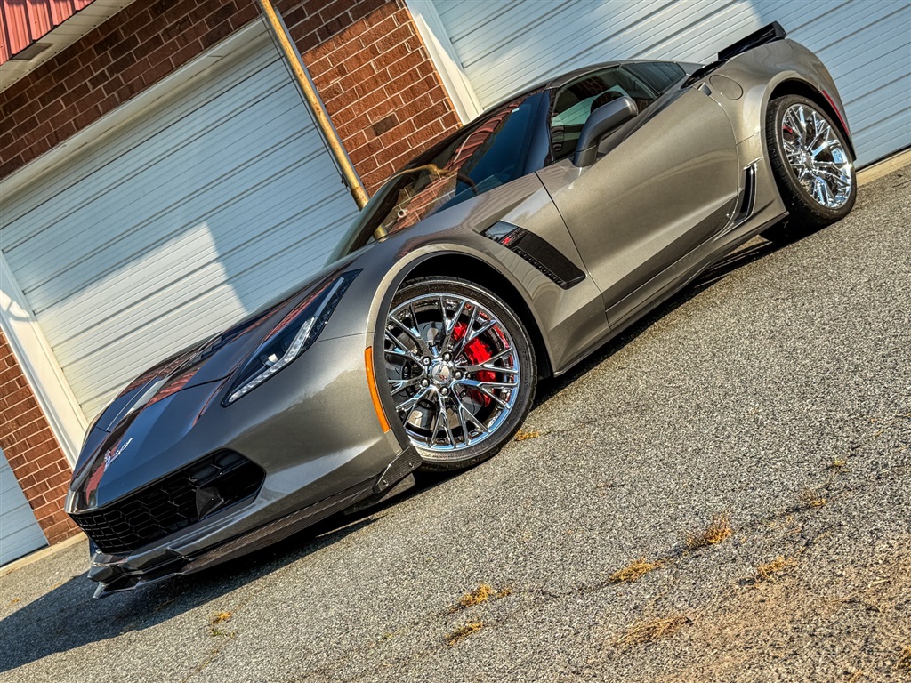 2015 Chevrolet Corvette Z06 3LZ Coupe with 17K Miles for $68,900. Shark Gray Metallic gives this Z06 a hard, low-slung look, and the stance backs it up. Garage kept and sharp throughout, this local, one-owner style car came to us on trade for a 2020 Shelby GT500, so it has clearly lived in enthusiast hands. Under the hood sits the supercharged 6.2L V8, putting out 650 horsepower through an 8-speed automatic transmission and a 2.41 rear axle. As a result, it delivers the kind of pull that pins you back and keeps coming. The Carbon Flash hood stinger stripe, visible carbon fiber ground effects, chrome Z06 wheels, and chrome badge package give it the right mix of muscle and polish. Inside, the 3LZ cabin feels every bit as serious as the sheet metal. Heated and ventilated GT bucket seats, carbon fiber trim, the sueded upper interior package, heads-up display, dual climate control, and driver memory make it easy to enjoy on a cruise or a back-road run. In addition, the Performance Data and Video Recorder adds a fun edge for drivers who want to relive every mile.