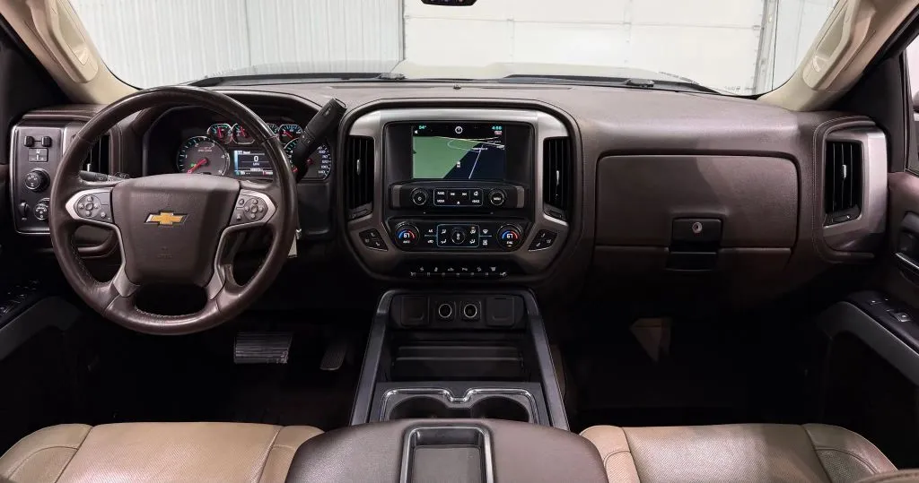 Used 2015 Chevrolet Silverado HDI. Clean title and it is a local trade in, it is loaded with dual power heated and cooled leather seats, heated steering wheel, navigation, power moonroof, back up camera, dual automatic climate control, steering wheel mounted audio control, power locks, power windows, power mirrors, cruise control, keyless entry, factory remote start and much more.