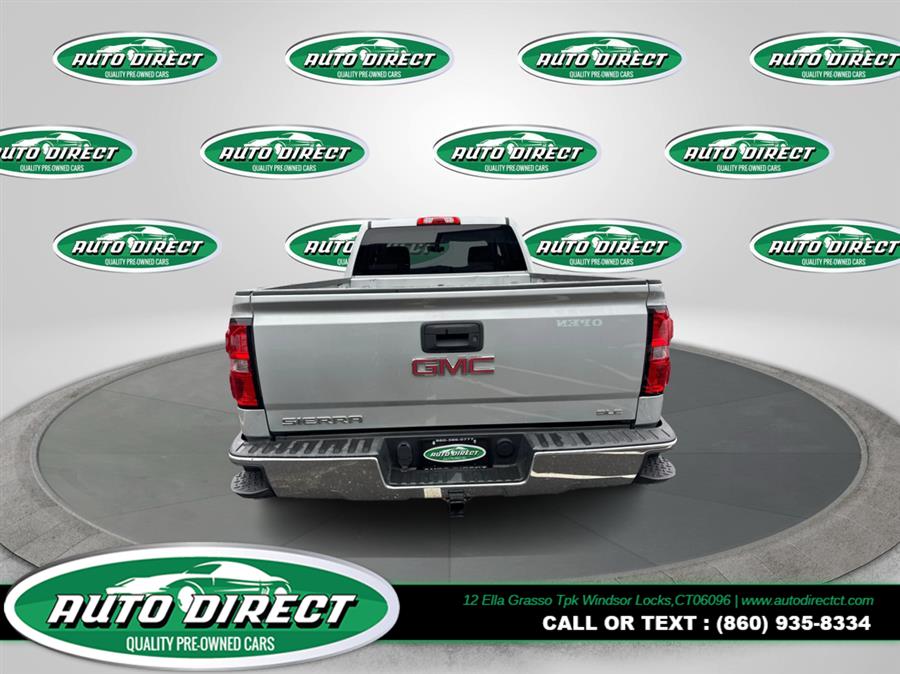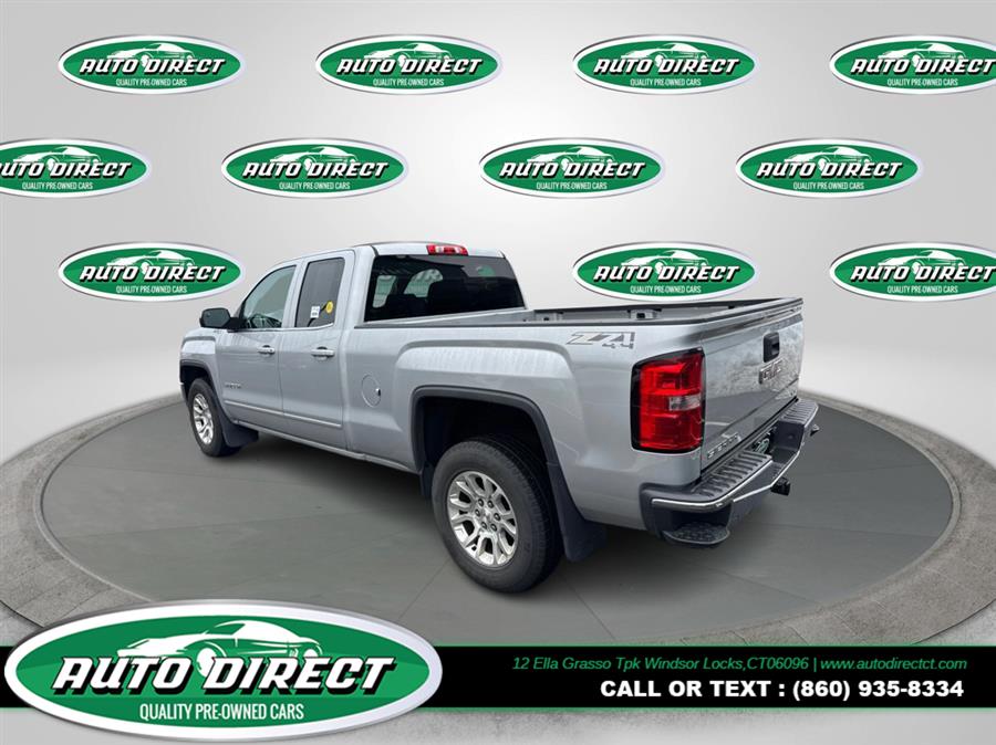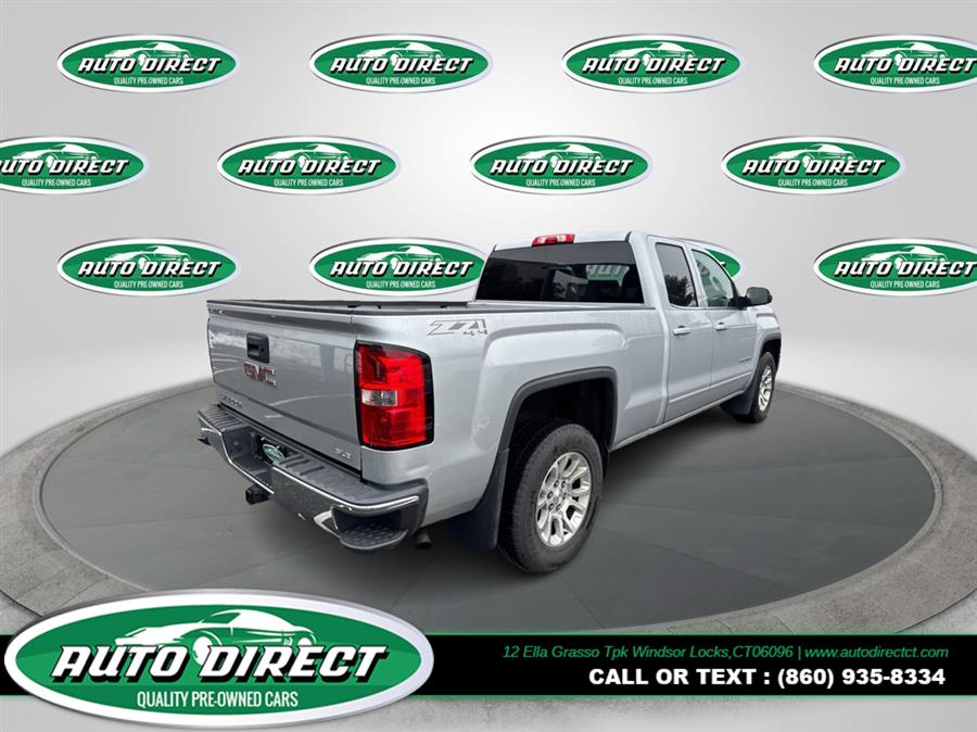 2015 GMC Sierra 1500 4WD Double Cab 143.5" SLE, available for sale in Windsor Locks, Connecticut. This vehicle features a Quicksilver Metallic exterior with Cocoa/Dune interior and is equipped with a 5.3L 8-cylinder engine and automatic transmission. The Sierra 1500 offers a comfortable ride, advanced safety features, and a spacious cabin, making it a practical choice for those needing capability and comfort in a pickup.