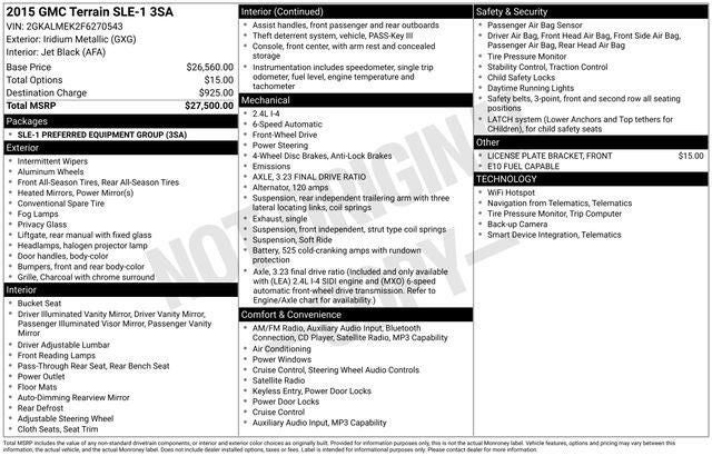 Discover the versatile and well-equipped 2015 GMC Terrain SLE-1, a midsize SUV that combines style, comfort, and functionality. This sleek silver Terrain offers an exceptional blend of performance, technology, and safety features, making it the perfect companion for your daily commute or weekend adventures. Powered by a 2.4L 4-cylinder engine and a smooth 6-speed automatic transmission, the Terrain delivers an impressive EPA-estimated 22 city/32 highway mpg, ensuring efficient and economical driving. Its spacious interior, with seating for up to five passengers, provides ample room for your family and cargo, while the available Preferred Equipment Group 3SA offers a host of desirable features. Step inside the Terrain and experience the exceptional comfort and convenience of the Cloth Seat Trim, the Auto-dimming Rearview Mirror, and the 17-inch Aluminum Wheels. The split-folding rear seat and generous cargo space ensure you can easily accommodate your lifestyle needs. Safety is a top priority in the Terrain, with features like Dual Front Airbags, Side-Impact Airbags, and the OnStar Directions & Connections system providing added peace of mind. The Four-Wheel Independent Suspension and Speed-Sensing Steering deliver a smooth and responsive driving experience, while the Traction Control and 4-Wheel Disc Brakes enhance control and confidence on the road. Whether you're commuting to the office, running errands, or embarking on a weekend getaway, the 2015 GMC Terrain SLE-1 is the versatile and well-equipped SUV that will exceed your expectations. Experience the difference for yourself by scheduling a test drive at our dealership today. We're confident you'll be impressed by the Terrain's exceptional value and capabilities.