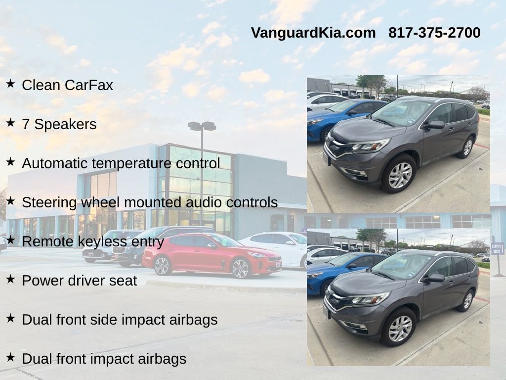 Discover the exceptional value and versatility of this 2015 Honda CR-V EX-L. With its spacious interior, advanced safety features, and premium amenities, this SUV is the perfect companion for your active lifestyle. Powered by a 2.4L I4 DOHC 16V i-VTEC engine paired with a smooth-shifting CVT transmission and all-wheel drive, the CR-V delivers a dynamic and efficient driving experience. Enjoy impressive fuel economy, with an EPA-estimated 26 mpg in the city and 33 mpg on the highway. The CR-V's exterior is accented by sleek, modern styling cues, including a bold front grille, stylish alloy wheels, and a power moonroof. Step inside and you'll be greeted by a well-appointed cabin, featuring premium leather-trimmed seating, a leather-wrapped steering wheel, and a host of advanced technology features. Convenience and comfort are paramount in this CR-V, with amenities like dual-zone automatic climate control, a rearview camera, and a premium audio system with SiriusXM satellite radio. The spacious cargo area and versatile split-folding rear seats make it easy to accommodate all your gear, from sports equipment to weekend getaway essentials. Safety is a top priority in the CR-V, with a comprehensive suite of advanced driver-assistance technologies, including dual front and side impact airbags, electronic stability control, and a tire pressure monitoring system. This well-maintained 2015 Honda CR-V EX-L is a fantastic opportunity to own a reliable, feature-rich SUV that will serve you well for years come. Schedule a test drive today and experience the exceptional value and capability of this exceptional vehicle.