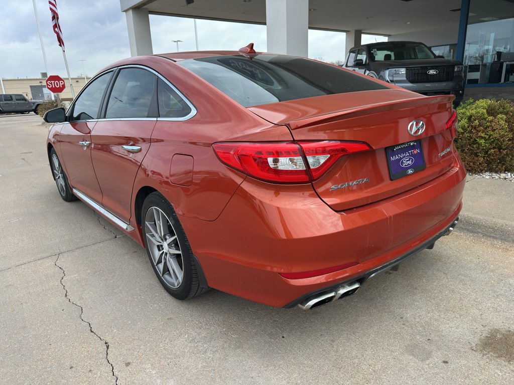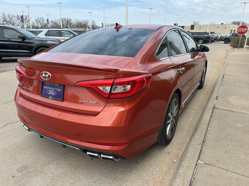 2015 Hyundai Sonata 2.0T Sport – Manhattan KS. Looking for a powerful, efficient midsize sedan at the best price? This 2015 Hyundai Sonata 2.0T Sport with FWD and a responsive 4-cylinder, 2.0L gasoline engine delivers spirited acceleration, confident handling, and excellent highway fuel economy. CARFAX 1-Owner gives you peace of mind about maintenance and ownership history. Premium leather seats and a comfortable interior make every drive enjoyable, while automatic climate control keeps the cabin at the perfect temperature year-round. Safety and convenience are enhanced by a back-up camera for easier parking and maneuvering in tight city spaces. Stay connected on the go with hands-free Bluetooth for calls and media streaming without taking your eyes off the road. Sport-tuned features and refined styling set this Hyundai Sonata apart from comparable pre-owned sedans. Whether commuting to work, running errands around Manhattan KS, or taking longer trips, this Hyundai Sonata balances performance, comfort, and value. Priced competitively to move quickly, this vehicle represents the best price in the area for a well-equipped, low-mileage example. Schedule a test drive in Manhattan KS today and experience the blend of efficiency, comfort, and sport-oriented performance that makes the 2015 Hyundai Sonata 2.0T Sport a smart choice.