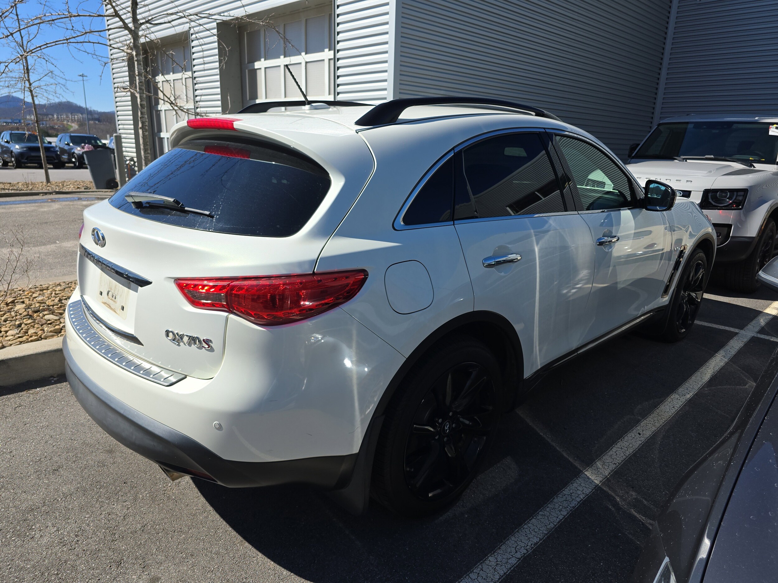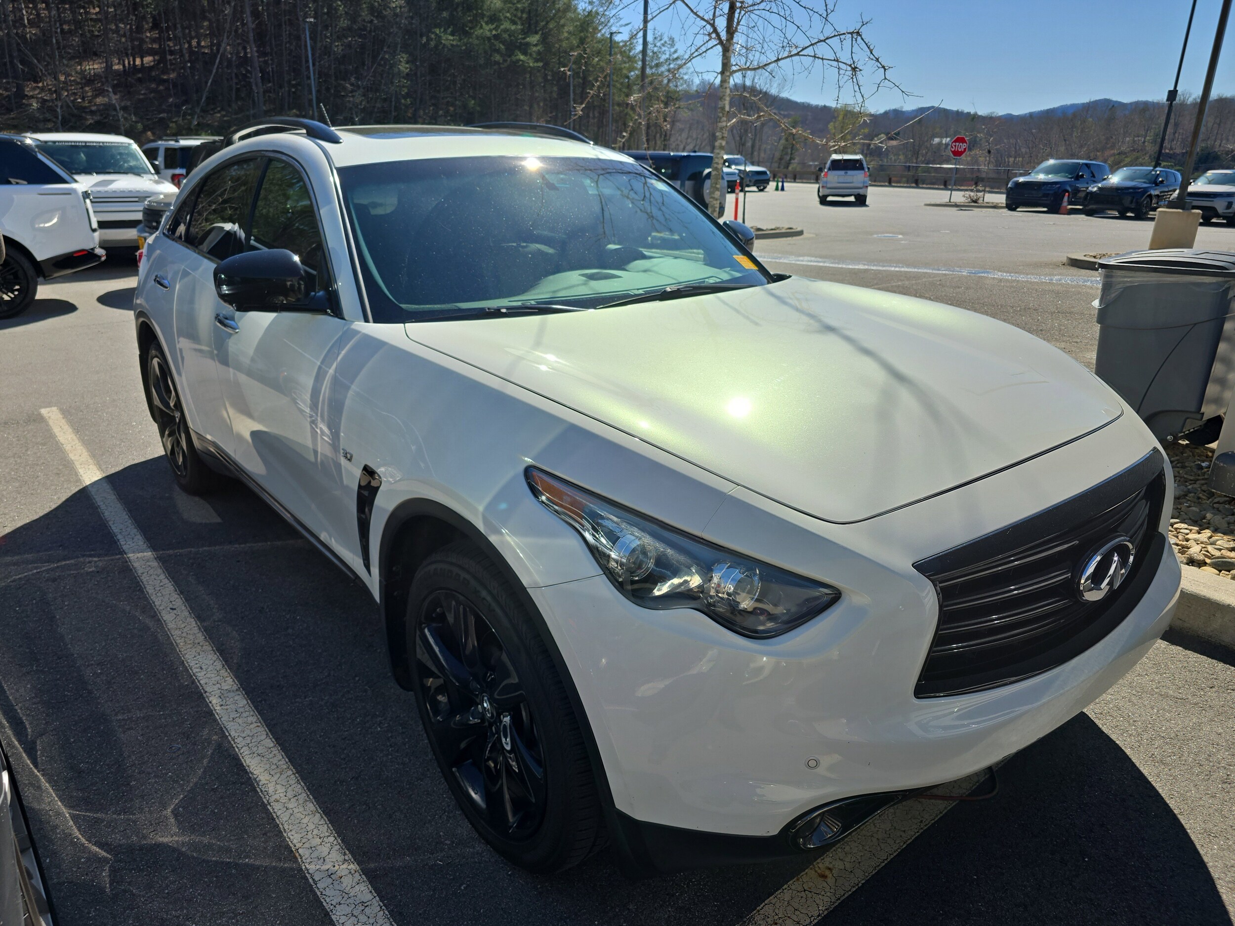 Moonlight White 2015 INFINITI QX70 AWD 7-Speed Automatic 3.7L V6 DOHC 24V Adaptive Front Lighting System, Aluminum Pedals, Aluminum Roof Rails, Around View Monitor w/Front & Rear Sonar System, Climate Controlled Sport Style Front Seats, Dark Finish Front Grille, Dark Finish Lower Side Moldings, Dark Finish Outside Mirror Housing, Dark Finish Roof Rails, Dual Occupant Memory System, Entry & Exit Assist System, Outside Mirrors w/Reverse Tilt-Down Feature, Power Tilt/Telescopic Steering Column, Premium Package, Radio: INFINITI Hard Drive Navigation System, Red S Badge, Solid Magnesium Paddle Shifters, Sport Package, Wheels: 21" x 9.5" 6-Spoke Enkei Aluminum-Alloy. Recent Arrival!