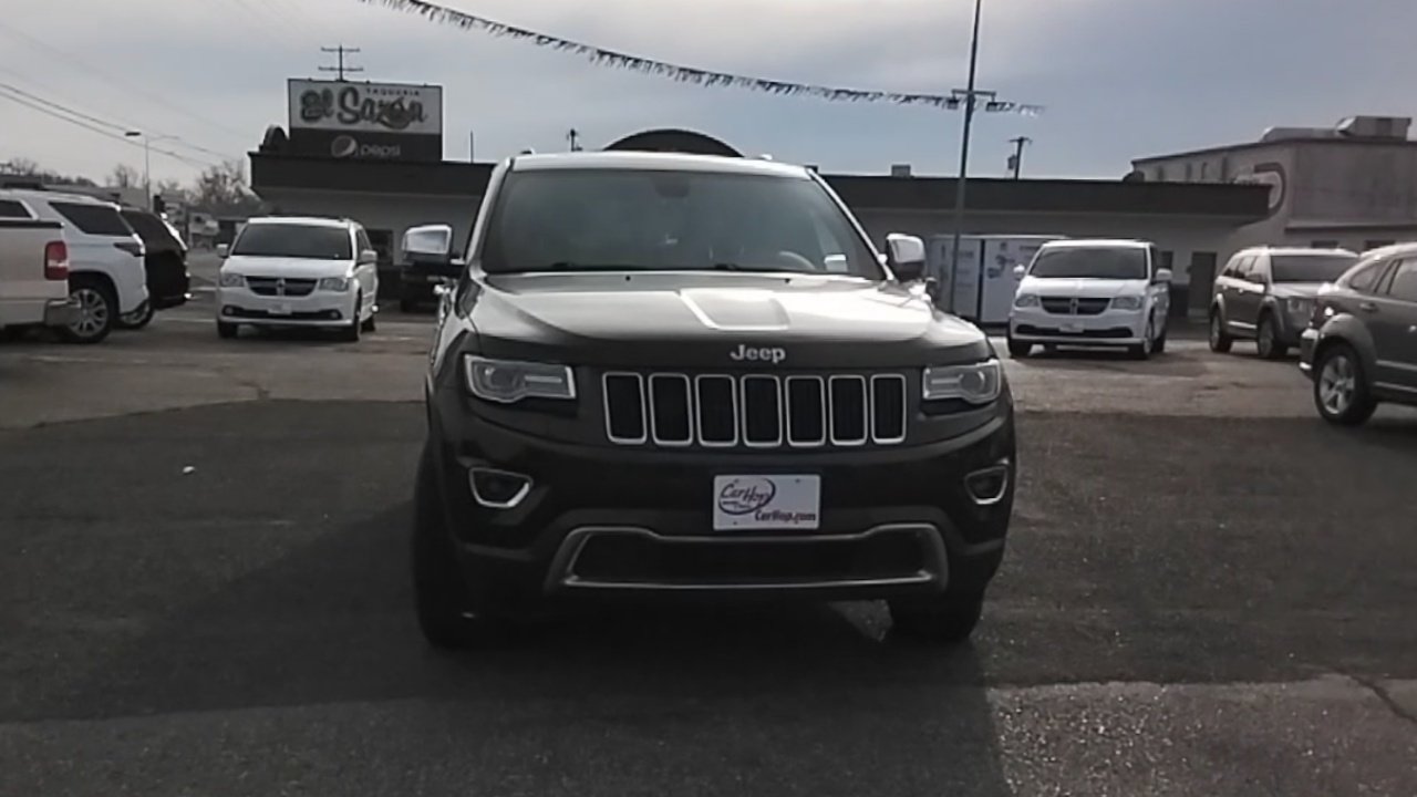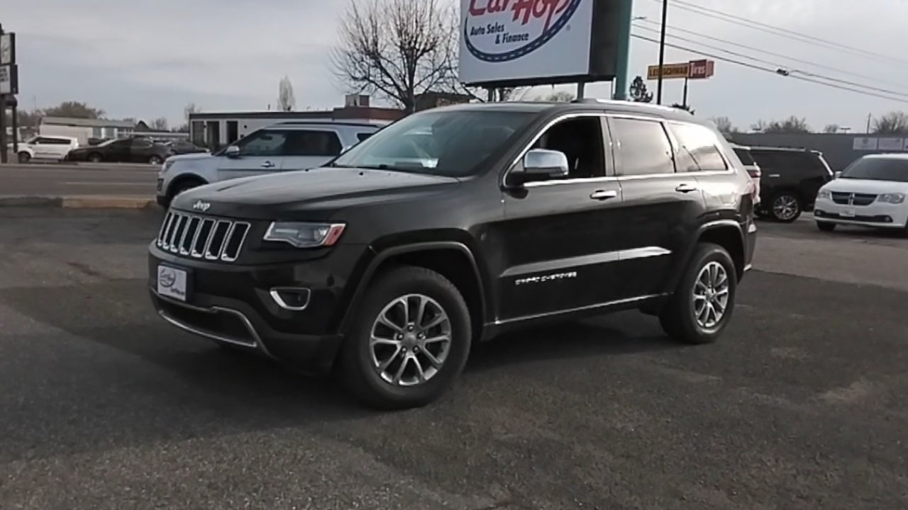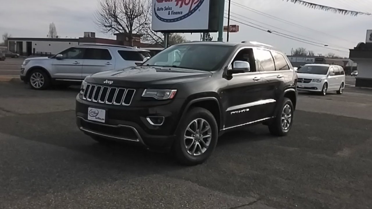 This pre-owned 2015 Jeep Grand Cherokee Limited is available at Carhop. It features a powerful 5.7L V-8 engine, four-wheel drive, and a comfortable interior with leather seats. The vehicle is equipped with advanced safety features and technology for a smooth and secure driving experience.