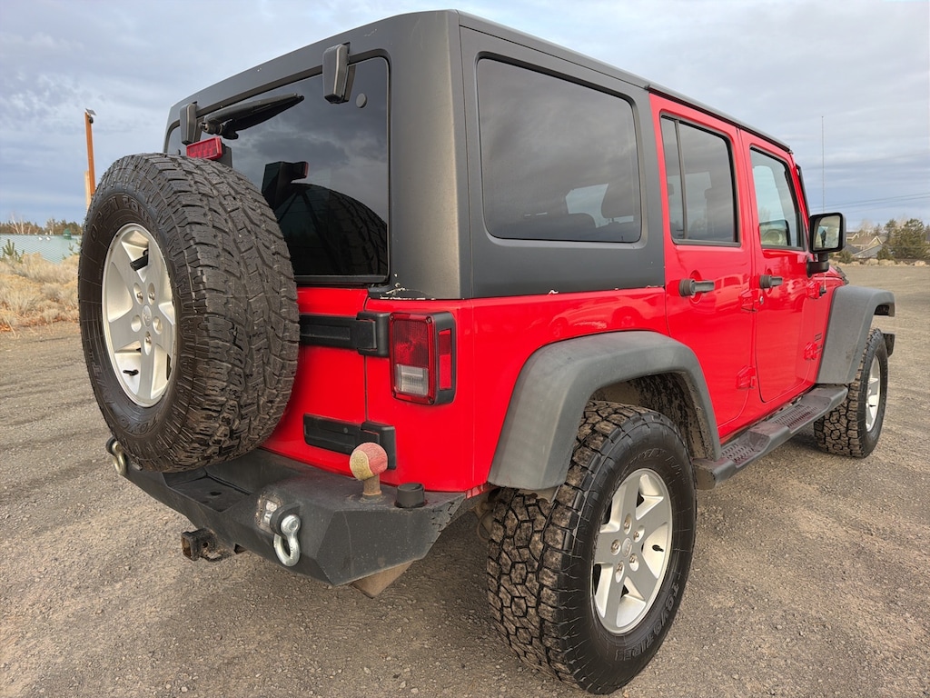 This Clean Carfax 2015 Jeep Wrangler Unlimited Sport 4WD delivers legendary off-road capability, rugged durability, and classic Jeep open-air adventure performance in a versatile 4-door SUV. This 4D Sport Utility is powered by a 3.6L V6 24V VVT engine paired with a 5-Speed Automatic transmission and 4WD, delivering strong low-end torque, dependable trail capability, and confident highway driving. Finished in bold Firecracker Red Clear Coat with premium Black interior, this Wrangler features a Black 3-Piece Hard Top, 17" Aluminum Wheels, Deep Tint Privacy Glass, and rugged exterior styling built for adventure and durability. Capability and performance features include Max Tow Package, Trailer Tow Group with 4-Pin Wiring, 3.73 Rear Axle Ratio, Anti-Spin Rear Differential, Class II Receiver Hitch, and Normal Duty Suspension for enhanced towing and off-road control. Comfort and convenience features include Leather-Wrapped Steering Wheel, Leather-Wrapped Shift Knob, Auto-Dimming Mirror with Reading Lamp, Power Heated Mirrors, Power Locks, Power Steering, Rear Window Defroster and Wiper, and Freedom Panel Storage Bag for easy roof panel storage. Technology and safety features include Uconnect Voice Command with Bluetooth, Vehicle Information Center Display, Tire Pressure Monitoring Display, Electronic Stability Control, Traction Control, Brake Assist, and Connectivity Group features for hands-free communication and audio control. If you're looking for a classic Wrangler that combines rugged off-road heritage, towing capability, and everyday usability this Jeep Wrangler Unlimited Sport 4WD is ready for its next adventure.