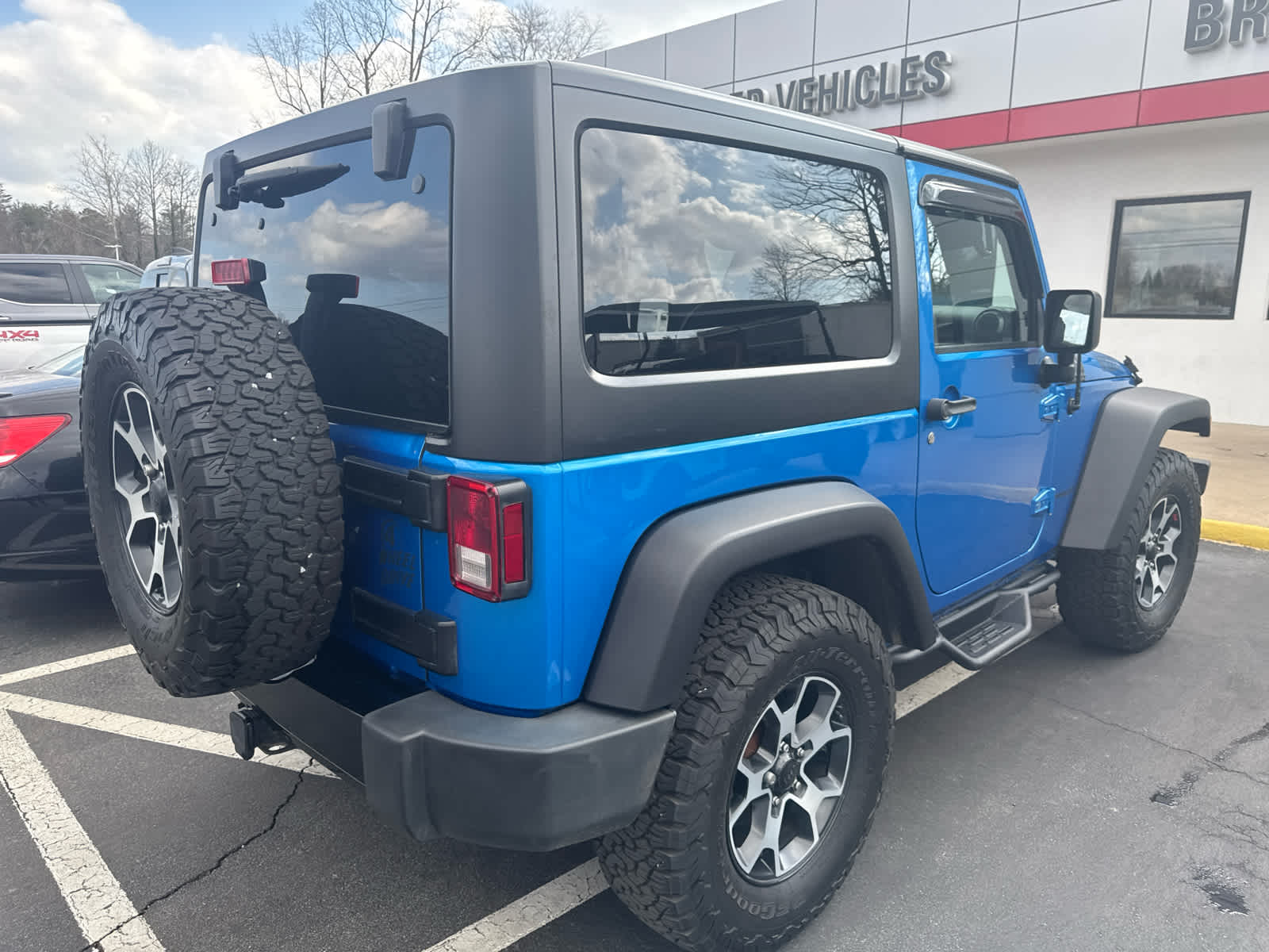 Theres generous ground clearance, minimal overhangs, and that distinctive Jeep look, of course. Being equipped with 4-wheel drive, the Wrangler is nearly unstoppable off road. Jeep Willys Wheeler with Hydro Blue Pearl Coat exterior and Black interior features a V6 Cylinder Engine with 285 HP at 6400 RPM.