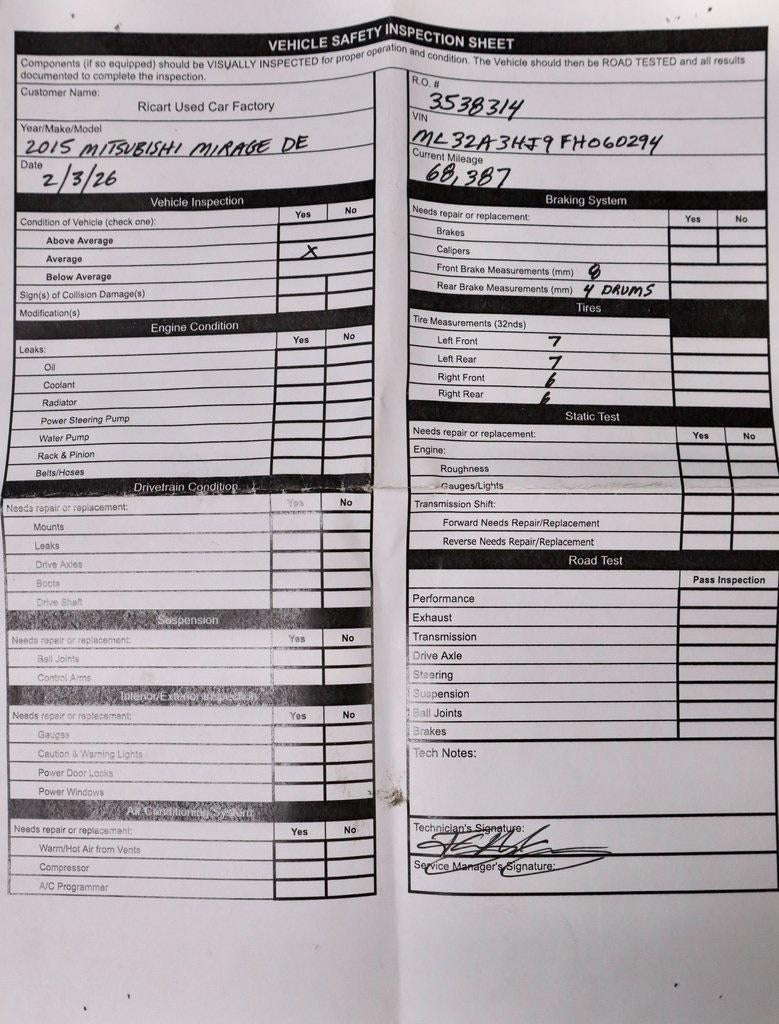 This 2015 Mitsubishi Mirage DE delivers exceptional efficiency and simple, dependable transportation in a compact hatchback design. Powered by a fuel-sipping gasoline engine paired with a smooth automatic transmission, it’s well suited for commuting and everyday errands with easy maneuverability. The interior offers a straightforward, functional layout designed to keep driving comfortable and uncomplicated. Known for its affordability and efficiency-focused engineering, this Mirage DE is available now at Ricart Automotive Used Car Factory. Recent Arrival! Odometer is 38441 miles below market average! Sapphire Blue 2015 Mitsubishi Mirage DE 4D Hatchback 1.2L 3-Cylinder DOHC MIVEC 5-Speed Manual FWD. Experience Hassle-Free Shopping at Ricart: Premium Quality Assurance, Express Checkout, Unmatched Transparency, Competitive Pricing, Exceptional Service by Exceptional People.