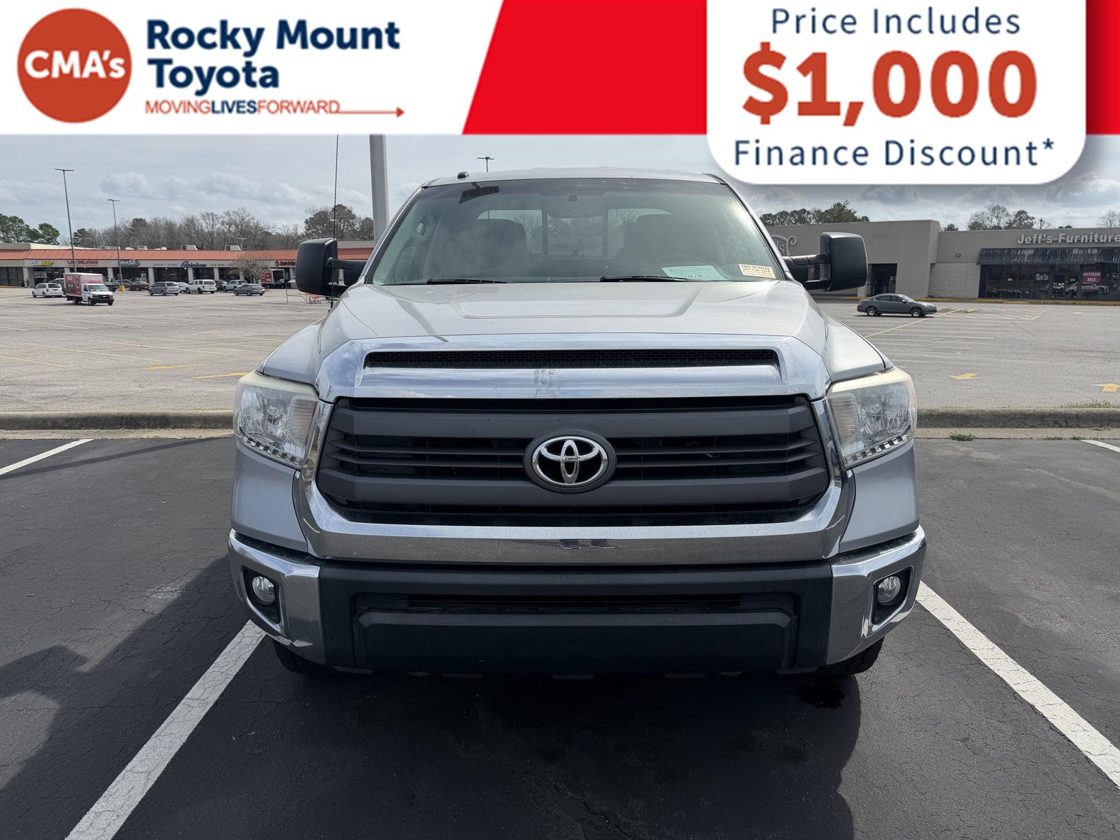 Thank you for choosing CMA's Rocky Mount Toyota, this 2015 Toyota Tundra SR5 is a great choice! Check out the following: No Accidents! One Owner! City 0/ Hwy 0. Pricing includes $1,000 dealer financing discount. Customer must finance with dealer through in house finance partners, or add back the $1,000 for any outside liens or cash purchases. Pricing excludes tax, tags, doc fee, and dealer added accessories. All vehicles are sold on a first come first serve basis due to multiple people interested in the same vehicles without prior knowledge. Pricing Info Good Today Through Close of Business. Pricing includes $1,000 dealer financing discount. Customer must finance with dealer through in house finance partners, or add back the $1,000 for any outside liens or cash purchases. Pricing excludes tax, tags, doc fee, and dealer added accessories. All vehicles are sold on a first come first serve basis due to multiple people interested in the same vehicles without prior knowledge. Pricing Info Good Today Through Close of Business. At Rocky Mount Toyota we believe in LIVE MARKET PRICING on all vehicles in our inventory. We use real-time market price comparisons to constantly adjust prices to provide all buyers the best value price possible. Pricing Info Good Today Through Close of Business. We utilize state-of-the-art technology to constantly monitor pricing trends in order to offer our shoppers our best competitive pricing and value. Our entire team is committed to helping you buy a car the way we would want to buy a car!