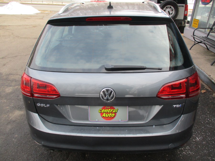 2015 Volkswagen Golf SportWagen 4dr DSG TDI S, available for sale in Meriden, Connecticut. This vehicle features a 2.0L TDI Diesel engine, front wheel drive, and a Platinum Gray Metallic exterior. The interior is finished in black and offers comfort with manually adjustable front seats, power recline, and adjustable lumbar support. The vehicle is equipped with a 6-speed automatic transmission and is available at Cos Central Auto in Meriden, CT.