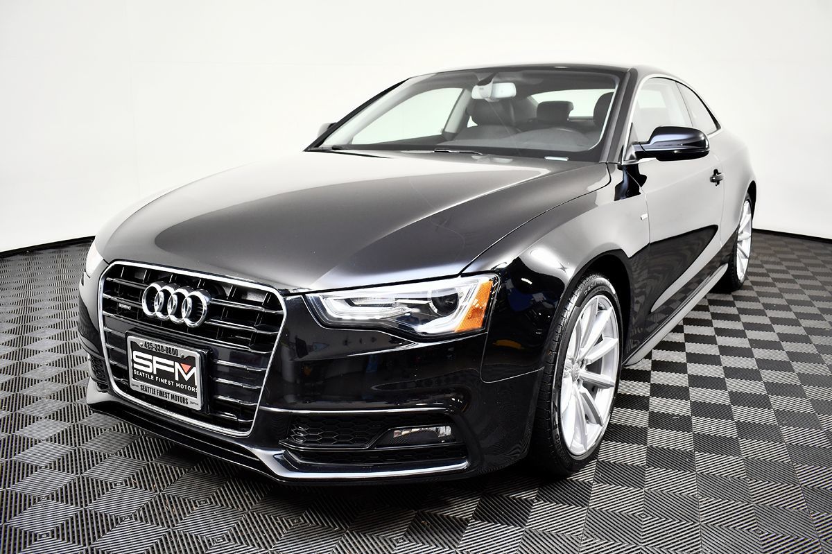 Our One Owner 2016 Audi A5 2.0T Premium Plus quattro Coupe is sure to catch your eye in Brilliant Black. Powered by a TurboCharged 2.0 Liter 4 Cylinder generating 220hp connected to an 8 Speed Automatic transmission for brisk acceleration. This All Wheel Drive coupe provides up to 30mpg on the highway, helping you every mile. You will also love our Audi's stunning S Line bodywork accented by a panoramic sunroof, HID headlamps, LED daytime running lights, and eye-catching alloy wheels. Our A5 Premium Plus offers heated power leather front seats with driver-side memory, a multi-function steering wheel, keyless entry/ignition, ambient lighting, and tri-zone automatic climate control, just a few of the features available at your fingertips. You will enjoy the full-color MMI infotainment system, which includes full-color navigation, Bluetooth®, available satellite radio, USB/Aux inputs, and Bang & Olufsen audio for your entertainment needs. Our Audi helps keep you and your passengers out of harm's way with advanced safety technologies. Rain-sensing wipers, advanced airbags, ABS, and stability/traction control are just a few of the features surrounding you for your peace of mind. Our A5 Premium Plus coupe offers everyday comfort, expressive style, and impressive performance to maximize driving pleasure! Save this Page and Call for Availability. We Know You Will Enjoy Your Seattle Finest Motors Test Drive Towards Ownership!