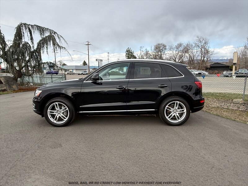 2016 Audi Q5 2.0T quattro Premium Plus — Mythos Black Metallic with Black leather interior. Powered by a 2.0L FlexFuel turbo I4 (220 hp, 258 lb-ft) and Audi quattro all-wheel drive. Factory features include power heated front seats with memory, full leather upholstery, panoramic sunroof, dual-zone automatic climate control, keyless entry and push-button start, power liftgate, Xenon headlights with LED daytime running lights, alloy wheels, rearview camera and front/rear parking sensors, Audi MMI infotainment with Bluetooth, USB/AUX and navigation/voice control, steering-wheel audio controls, cruise control, and full safety suite (ABS, stability/traction control, multiple airbags). Below 106,000 miles (averaging under 10,000 miles/year) and in excellent overall condition — a well-equipped, comfortable, and capable SUV.