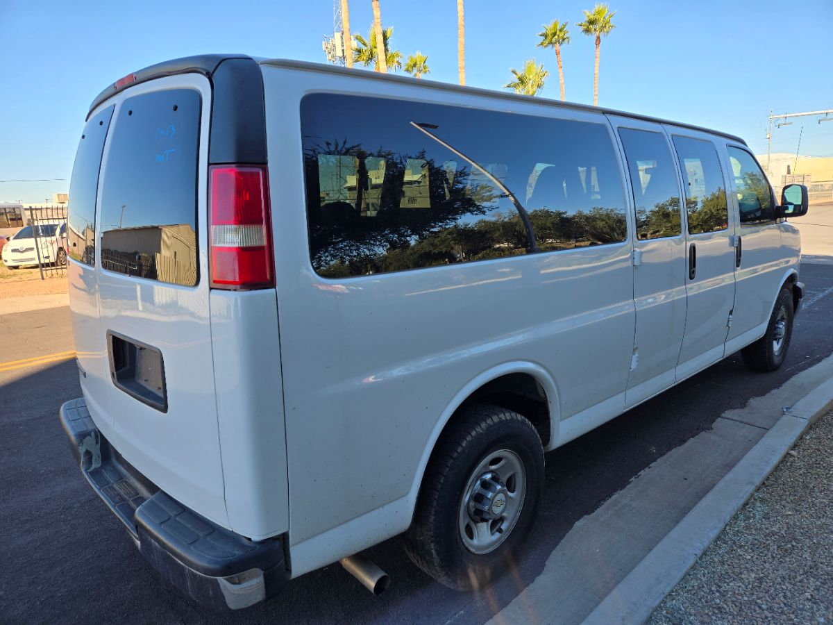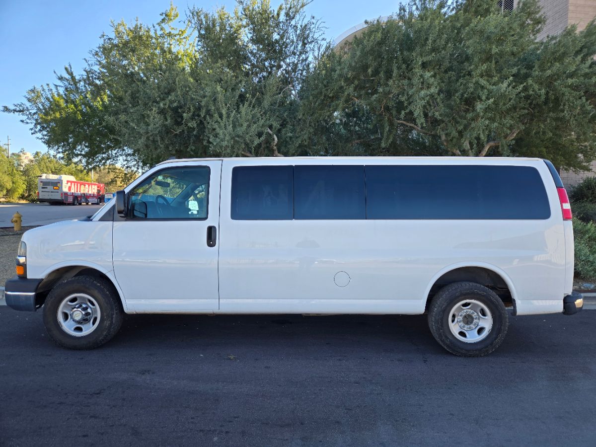 The 2016 Chevrolet Express Passenger RWD 3500 155" LT w/1LT is a versatile and robust van that's perfectly engineered to transport large groups comfortably. Sporting a clean and classic Summit White exterior, this vehicle embodies both form and function, making it an attractive choice for business or personal use. The accommodating interior is dressed in Medium Pewter, offering a stylish and durable environment capable of seating up to 15 passengers in a 2-3-3-3-4 configuration. Under the hood, the Express is powered by a 4.8L 8-cylinder engine, ensuring ample power and performance for any journey. The RWD 3500 155" LT w/1LT package enhances the vehicle with specific features that cater to ease of use and driving pleasure. The leather-wrapped steering wheel elevates the interior feel, providing both comfort and style for the driver. Entertainment is easily accessible through the audio system, which consists of an AM/FM stereo with a CD/MP3 player, ensuring passengers have access to their favorite tunes. For those who need connectivity on the go, Bluetooth for phone comes standard, keeping communication hands-free and safe. The 2016 Chevrolet Express Passenger is not only spacious and capable, but also offers an impressive balance of practicality and modern conveniences, making it a wise choice for those who need to move passengers efficiently.