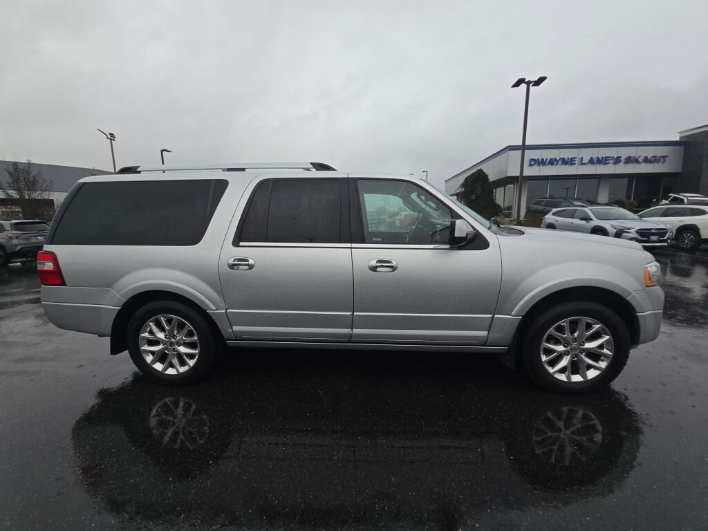 Silver 2016 Ford Expedition EL Limited 4WD 6-Speed Automatic EcoBoost 3.5L V6 GTDi DOHC 24V Twin Turbocharged Expedition EL Limited, 4WD, 12 Speakers, 20" Polished Aluminum Wheels, 3rd row seats: split-bench, 4-Wheel Disc Brakes, ABS brakes, Adjustable pedals, Air Conditioning, Alloy wheels, AM/FM radio: SiriusXM, Auto-dimming door mirrors, Auto-dimming Rear-View mirror, Automatic temperature control, Brake assist, Bumpers: body-color, CD player, Compass, Delay-off headlights, Driver door bin, Driver vanity mirror, Dual front impact airbags, Dual front side impact airbags, Electronic Stability Control, Emergency communication system: 911 Assist, Exterior Parking Camera Rear, Four wheel independent suspension, Front anti-roll bar, Front Bucket Seats, Front Center Armrest, Front dual zone A/C, Front fog lights, Front reading lights, Fully automatic headlights, Garage door transmitter, GVWR: 7,720 lbs Payload Package, Heated & Cooled Perforated Leather Fr Bucket Seats, Heated door mirrors, Heated front seats, Heated rear seats, Illuminated entry, Leather Shift Knob, Leather steering wheel, Limited Slip w/3.73 Axle Ratio, Low tire pressure warning, Memory seat, Occupant sensing airbag, Outside temperature display, Overhead airbag, Overhead console, Panic alarm, Passenger door bin, Passenger vanity mirror, Pedal memory, Power door mirrors, Power driver seat, Power Liftgate, Power passenger seat, Power steering, Power windows, Radio data system, Radio: Premium Sony Sound System w/Single-Disc/MP3, Rain sensing wipers, Rear air conditioning, Rear anti-roll bar, Rear audio controls, Rear reading lights, Rear window defroster, Rear window wiper, Remote keyless entry, Roof rack, Security system, SiriusXM Satellite Radio, Speed control, Speed-sensing steering, Speed-Sensitive Wipers, Split folding rear seat, Steering wheel mounted audio controls.