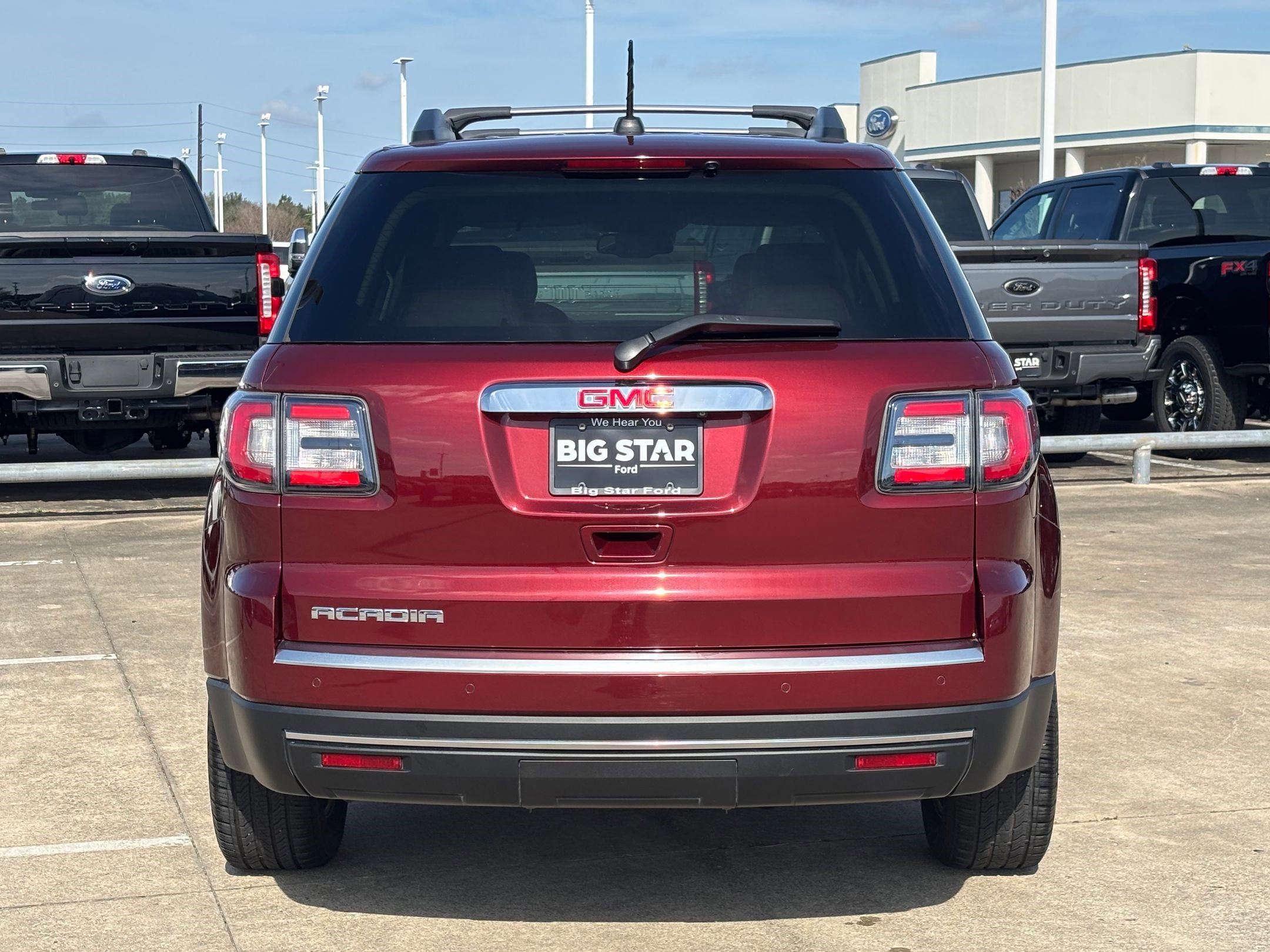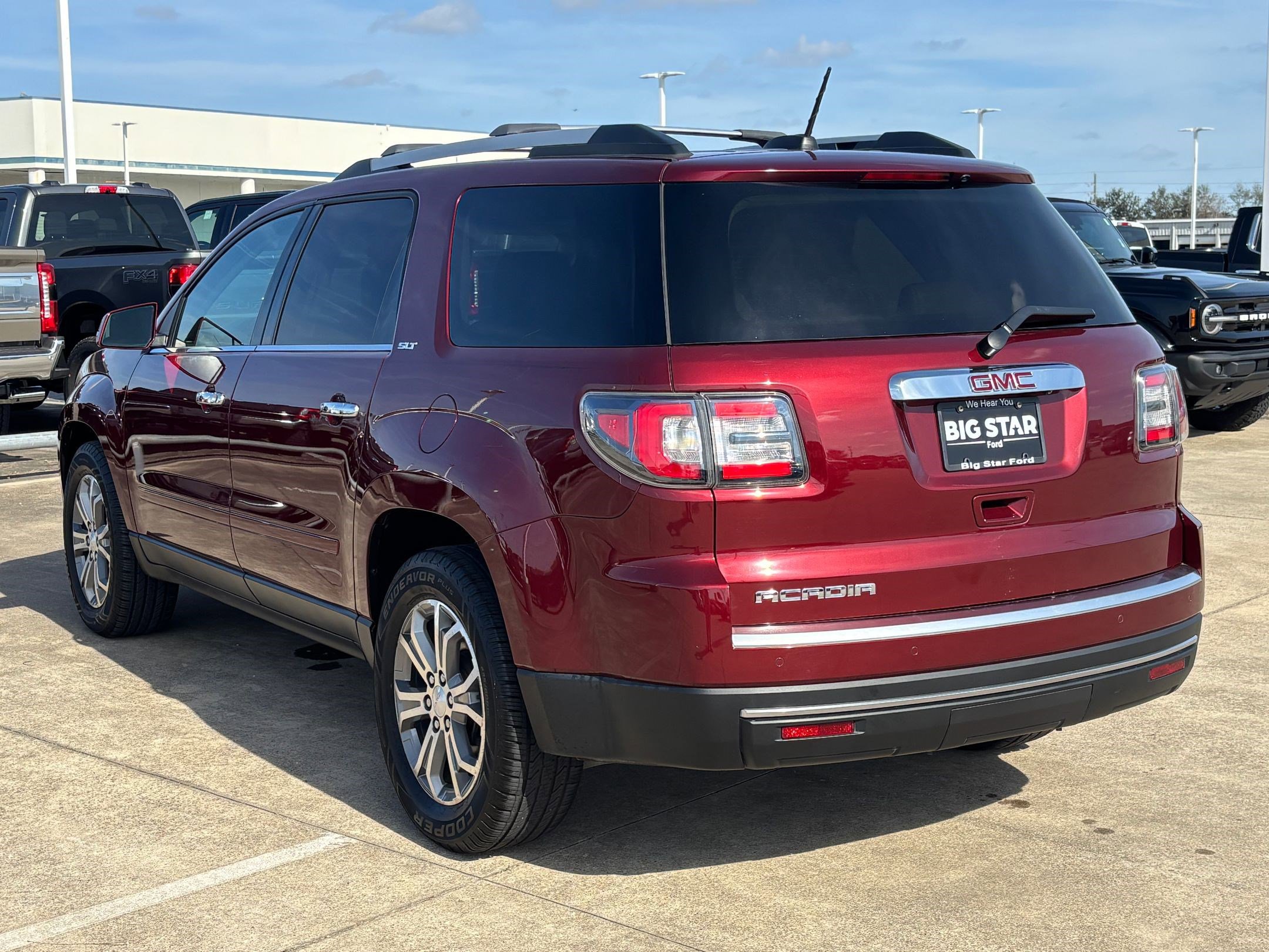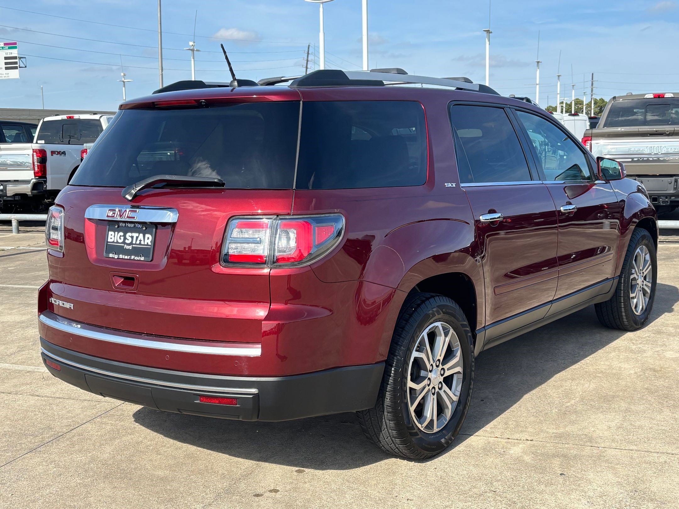 Big Star Ford is pumped up to offer this superb 2016 GMC Acadia. Crimson Red Tintcoat SLT-1 FWD Recent Arrival! Odometer is 21987 miles below market average! This vehicle is equipped with Acoustical Insulation Package, Open Road Package, Preferred Equipment Group 4SA, Trailering Equipment, FWD, Dark Cashmere Leather, and more. Stop by today for an exceptional car buying experience. Located at 17717 South Freeway, Manvel, TX 77578. After the sale of a vehicle, it may take up to 72 hours for a vehicle to be removed from this site. Please verify the accuracy of the vehicle's information with the dealership and sales manager. Price does not include tax, title, license fees, or dealer installed items. It is the sole responsibility of the customer to check for installed items and availability of vehicles. All efforts are made to ensure accurate listings, but errors do occur. Please see dealer for more details.