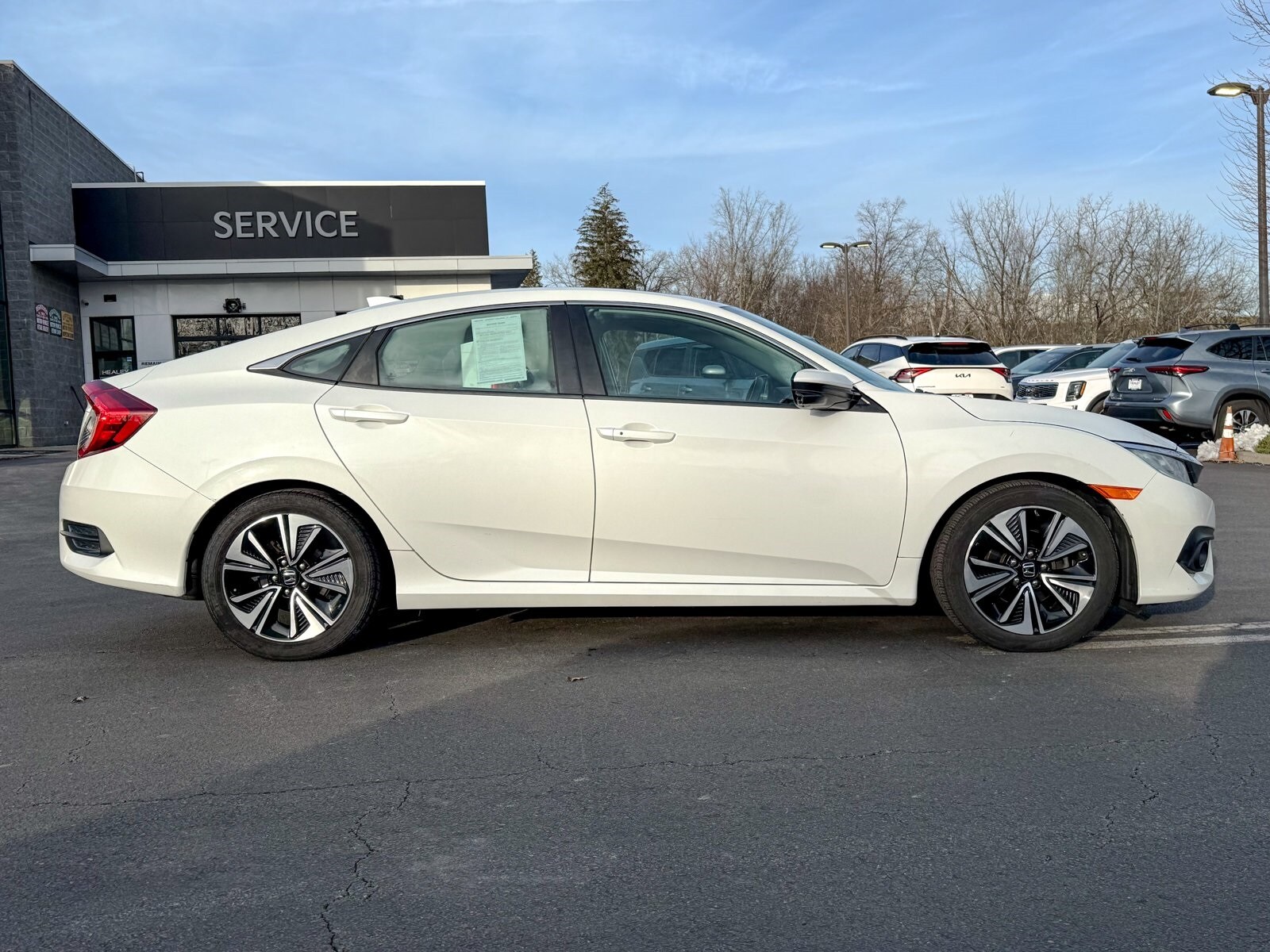 White 2016 Honda Civic EX-L 1.5L I-4 DI DOHC Turbocharged CVT FWD 17 Alloy Wheels, 4-Wheel Disc Brakes, 8 Speakers, ABS brakes, Air Conditioning, Alloy wheels, AM/FM radio: SiriusXM, Apple CarPlay/Android Auto, Auto-dimming Rear-View mirror, Automatic temperature control, Brake assist, Bumpers: body-color, Compass, Delay-off headlights, Driver door bin, Driver vanity mirror, Dual front impact airbags, Dual front side impact airbags, Electronic Stability Control, Emergency communication system: HondaLink Assist, Exterior Parking Camera Rear, Four wheel independent suspension, Front anti-roll bar, Front Bucket Seats, Front Center Armrest, Front dual zone A/C, Front fog lights, Front reading lights, Fully automatic headlights, Heated door mirrors, Heated front seats, Illuminated entry, Leather Seat Trim, Leather Shift Knob, Low tire pressure warning, Occupant sensing airbag, Outside temperature display, Overhead airbag, Panic alarm, Passenger door bin, Passenger vanity mirror, Power door mirrors, Power driver seat, Power moonroof, Power steering, Power windows, Radio data system, Radio: 180-Watt AM/FM/HD/SiriusXM Audio System, Rear anti-roll bar, Rear seat center armrest, Rear window defroster, Reclining Heated Front Bucket Seats, Remote keyless entry, Security system, Speed control, Speed-sensing steering, Speed-Sensitive Wipers, Split folding rear seat, Spoiler, Steering wheel mounted audio controls, Tachometer, Telescoping steering wheel, Tilt steering wheel, Traction control, Trip computer, Variably intermittent wipers.