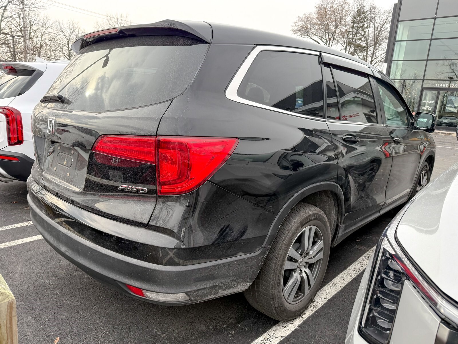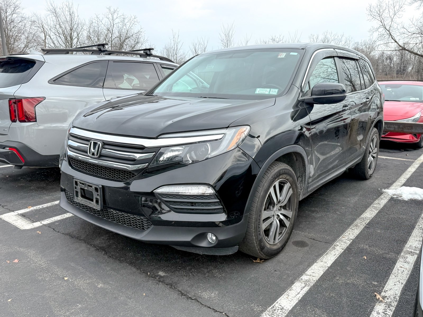 Crystal Black Pearl 2016 Honda Pilot EX-L 3.5L V6 24V SOHC i-VTEC 6-Speed Automatic AWD 18 Alloy Wheels, 3rd row seats: split-bench, 4-Wheel Disc Brakes, 4.25 Axle Ratio, 7 Speakers, ABS brakes, Air Conditioning, Alloy wheels, AM/FM radio: SiriusXM, Auto-dimming Rear-View mirror, Automatic temperature control, Brake assist, Bumpers: body-color, Compass, Delay-off headlights, Driver door bin, Driver vanity mirror, Dual front impact airbags, Dual front side impact airbags, Electronic Stability Control, Emergency communication system: HondaLink Assist, Exterior Parking Camera Rear, Four wheel independent suspension, Front anti-roll bar, Front Bucket Seats, Front Center Armrest, Front dual zone A/C, Front fog lights, Front reading lights, Fully automatic headlights, Garage door transmitter: HomeLink, Heated door mirrors, Heated Front Bucket Seats, Heated front seats, Illuminated entry, Leather Shift Knob, Leather-Trimmed Seats, Low tire pressure warning, Occupant sensing airbag, Outside temperature display, Overhead airbag, Overhead console, Panic alarm, Passenger door bin, Passenger vanity mirror, Power door mirrors, Power driver seat, Power Liftgate, Power moonroof, Power passenger seat, Power steering, Power windows, Radio data system, Radio: AM/FM Audio System, Rear air conditioning, Rear anti-roll bar, Rear reading lights, Rear seat center armrest, Rear window defroster, Rear window wiper, Remote keyless entry, Security system, SiriusXM Radio, Speed control, Speed-sensing steering, Speed-Sensitive Wipers, Split folding rear seat, Spoiler, Steering wheel mounted audio controls, Tachometer, Telescoping steering wheel, Tilt steering wheel, Traction control, Trip computer, Variably intermittent wipers.
