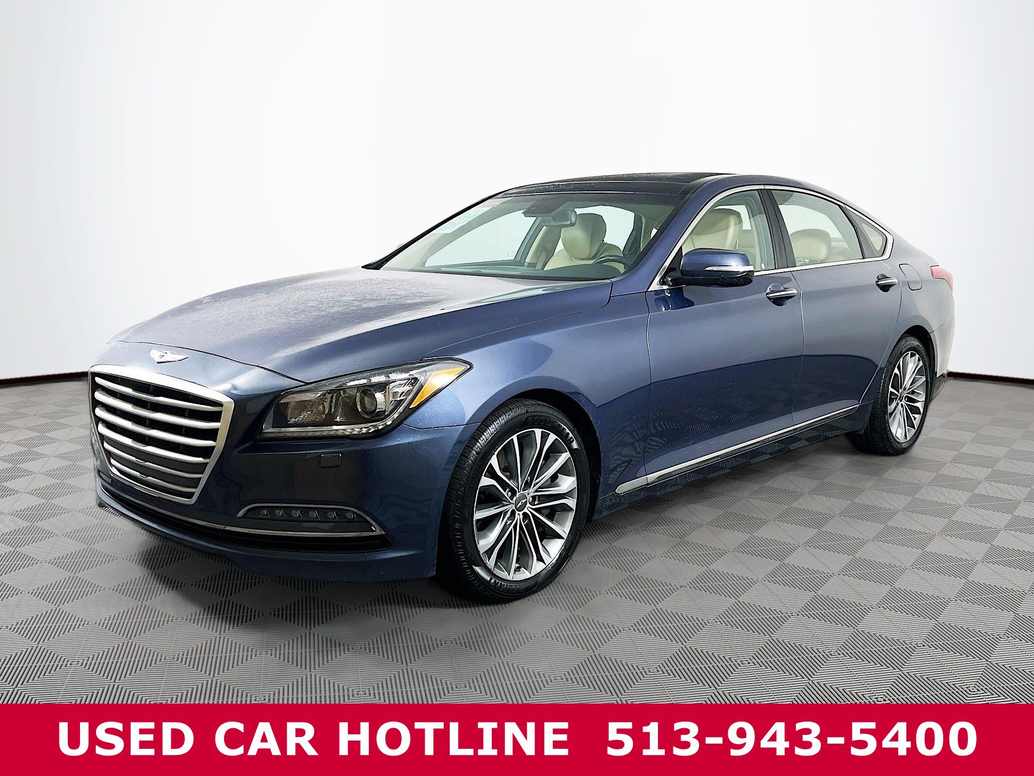 Jeff Wyler Eastgate Auto Mall is excited to offer this outstanding 2016 Hyundai Genesis 3.8 in Montecito Blue. Well equipped with: Signature Package 02 (Auto-Dimming Side Mirrors, Blind Spot Detection (BSD), Integrated Memory System (IMS), LED Fog Lamps, Power Heated/Cooled Front Bucket Seats, Power Rear Window Sunshade, Power Tilt-and-Slide Panoramic Sunroof, Power Tilt-and-Telescopic Steering Wheel, Radio: AM/FM/HD/SiriusXM/CD/DVD/MP3 Audio System, and Rearview Camera w/Parking Guidelines), 4-Wheel Disc Brakes, 7 Speakers, ABS brakes, Air Conditioning, Alloy wheels, AM/FM radio: SiriusXM, Anti-whiplash front head restraints, Auto-dimming Rear-View mirror, Automatic temperature control, Bodyside moldings, Brake assist, Bumpers: body-color, Carpeted Floor Mats (DISC), CD player, Compass, Delay-off headlights, Driver door bin, Driver vanity mirror, Dual front impact airbags, Dual front side impact airbags, Electronic Stability Control, Emergency communication system: Blue Link, Exterior Parking Camera Rear, Four wheel independent suspension, Front anti-roll bar, Front Bucket Seats, Front Center Armrest w/Storage, Front dual zone A/C, Front reading lights, Fully automatic headlights, Garage door transmitter: HomeLink, Heated door mirrors, Heated front seats, Heated rear seats, Heated steering wheel, High intensity discharge headlights: Bi-Xenon, Illuminated entry, Knee airbag, Leather Seating Surfaces, Leather steering wheel, Low tire pressure warning, Navigation System, Occupant sensing airbag, Option Group 02, Outside temperature display, Overhead airbag, Overhead console, Panic alarm, Passenger door bin, Passenger vanity mirror, Power door mirrors, Power driver seat, Power Heated Front Bucket Seats, Power passenger seat, Power steering, Power windows, Radio: AM/FM/SiriusXM/HD/CD/MP3 Audio System, Rain sensing wipers, Rear anti-roll bar, Rear Bumper Applique, Rear reading lights, Rear seat center armrest, Rear side impact airbag, Rear window defroster, Remote keyless entry, Reversible Cargo Tray, Security system, Speed control, Speed-sensing steering, Speed-Sensitive Wipers, Steering wheel mounted audio controls, Tachometer, Telescoping steering wheel, Tilt steering wheel, Traction control, Trip computer, Turn signal indicator mirrors, Variably intermittent wipers, Wheel Locks.