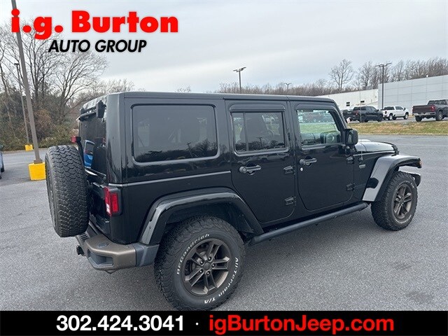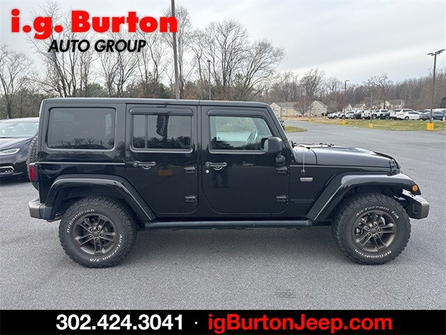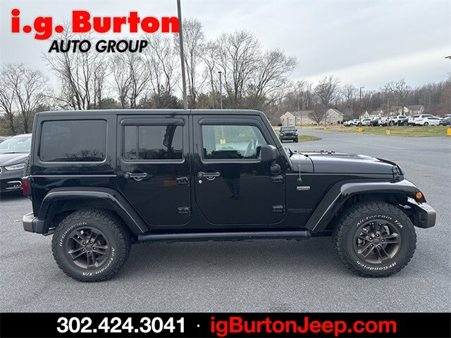 Wrangler Unlimited Sahara, 4D Sport Utility, 3.6L V6 24V VVT, 5-Speed Automatic, 4WD, Black Clearcoat, Black Leather, 2 Front & 1 Rear Bronze Tow Hook, 75th Anniversary Badge, Anti-Spin Differential Rear Axle, Body Color Grille w/Bronze Accent, Bronze Jeep Grille Badge, Bronze Trail Rated Badge, Chrome/Leather Wrapped Shift Knob, Class II Receiver Hitch, Connectivity Group, Heated Front Seats, Hood w/Power Dome, Jeep 75th Anniversary Package, Leather Seat w/Cloth (Ombre Mesh), Leather Wrapped Steering Wheel, Low Gloss Black Wrangler Decal, MOPAR Slush Mats, Moroccan Sun Instrument Panel Bezel, Moroccan Sun Interior Accents, Painted Front Bumper, Painted Rear Bumper, Premium Black Sunrider Soft Top, Quick Order Package 24H 75th Anniversary, Radio: 430, Remote USB Port, Sunrider Soft Top, Tire Pressure Monitoring Display, Trailer Tow Group, Trailer Tow w/4-Pin Connector Wiring, Uconnect Voice Command w/Bluetooth, Vehicle Information Center, Wheels: 17 x 7.5 Aluminum Bronze. Recent Arrival! 2016 Jeep Wrangler Unlimited Sahara Odometer is 27879 miles below market average! Since 1908, i.G. Burton Auto Group has served Delmarva and its surrounding communities with outstanding sales and service as its longest-standing family-owned and operated dealer group. See why we proudly say, "Nobody Beats a Burton Deal! NOBODY!"