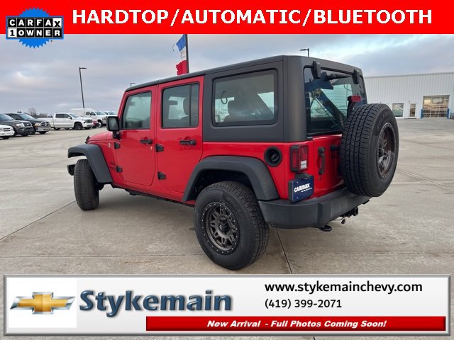 2016 Jeep Wrangler Unlimited Sport 4WD hardtop Bluetooth Firecracker Red Clearcoat. Clean vehicle history...no accidents. Connectivity Group, Quick Order Package 24C, Remote USB Port, Tire Pressure Monitoring Display, Uconnect Voice Command with Bluetooth, Vehicle Information Center. Test drive any used vehicle and receive $50. Drive a vehicle and get $50. No pressure to purchase. Act now. One gift card per household per year. Call 419-399-2071 today for your appointment. Go to www.stykemainchevy.com and fill out your test drive form. Must bring printed form with you to receive $50. Don't forget...most of our preowned vehicles come with a 3 month - 3,000 warranty...free of charge. Contact us to find out if this one qualifies.