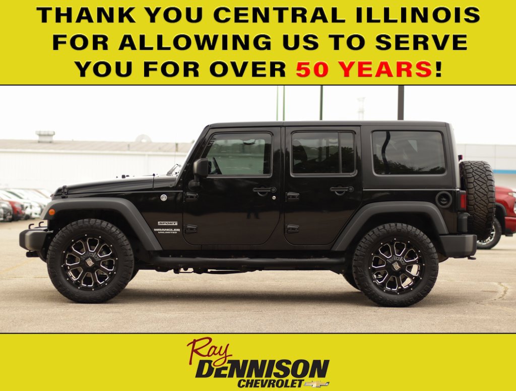 Ultra Low Miles - Extra Tops - Aftermarket wheels - Upgraded Stereo!! If you’re in the market for a rugged, adventure-ready SUV with genuine off-road DNA, the 2016 Jeep Wrangler Unlimited Sport is a compelling choice. The “Unlimited” 4-door body gives you extra space for gear or passengers while retaining the classic Wrangler appeal. Its 3.6 L Pentastar V6 engine delivers 285 hp and 260 lb-ft of torque, and the part-time 4×4 system means it can handle trails, mud, rocks, or snow with confidence. The removable doors, fold-down windshield, and convertible top options turn every drive into an experience, giving you true open-air freedom. Because this is a tried-and-true design, there’s a huge aftermarket ecosystem of parts and accessories—so you can customize it exactly to your tastes and terrain. Finally, for buyers seeking a vehicle that’s as much about lifestyle as it is about transportation, the Wrangler Unlimited Sport delivers character, capability, and an unbeatable “fun factor” that many mainstream SUVs simply can’t match. 50th Anniversary Sale!!! Come in and find out why we are the largest Chevrolet dealer in Peoria and the #1 Chevrolet dealer in Central Illinois!! Your Family owned local Chevy store for 50 Years!