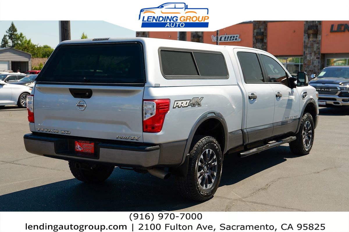 Built to conquer the road less traveled, our 2016 Nissan Titan XD PRO-4X Crew Cab 4X4 looks sharp in Brilliant Silver. Powered by a TurboCharged 5.0 Liter Cummins Diesel V8 that generates 310hp and 555lb-ft of torque paired with an HD 6 Speed Automatic transmission. This Four Wheel Drive team offers Bilstein off-road performance shocks and exceptional ground clearance that's ready to roll! It's impossible to ignore the rugged good looks of this workhorse that packs every tool you need to get hard jobs done with ease. Our Titan PRO-4X takes care of you with an integrated gooseneck hitch, front tow hooks, class IV tow hitch receiver, transfer case, and lower radiator skid plates. Steps bars and a bed topper have been installed for you, too. The XD PRO-4X cabin is sleek and impressive with ambient lighting, remote keyless entry, the advanced drive-assist display, a 40/20/40 split front bench seat with a center console, and a 60/40 split fold-up rear bench seat. Settle in and enjoy the ride as you'll stay safely connected via Bluetooth®, NissanConnect with mobile apps, and an AM/FM/CD display audio system with MP3, available satellite radio, and radio data system. Drive with confidence as our Nissan Titan has been built strong with a high strength steel frame and comes equipped with advanced airbags, trailer sway control, ABS, traction control, and a tire pressure monitoring system. Offering full-size strength and heavy-duty attitude, our Nissan Titan is calling your name! Save this Page and Call for Availability. We Know You Will Enjoy Your Test Drive Towards Ownership!