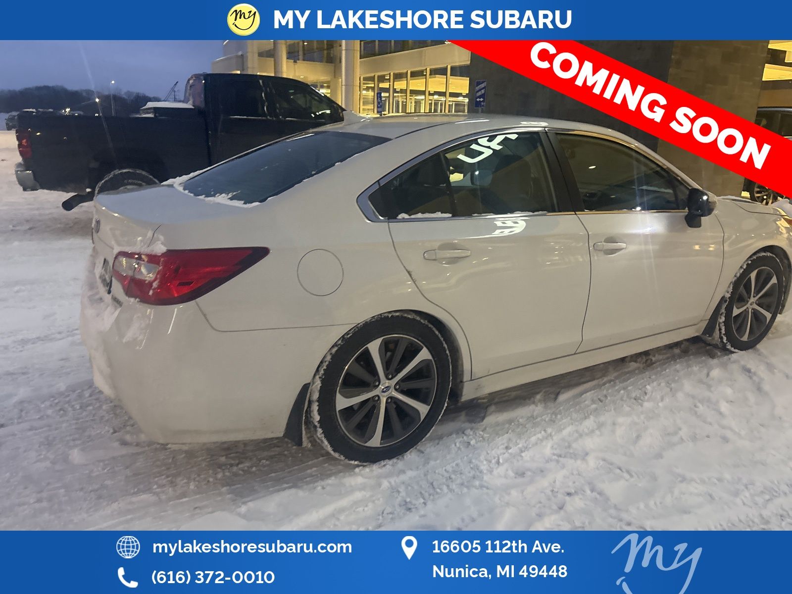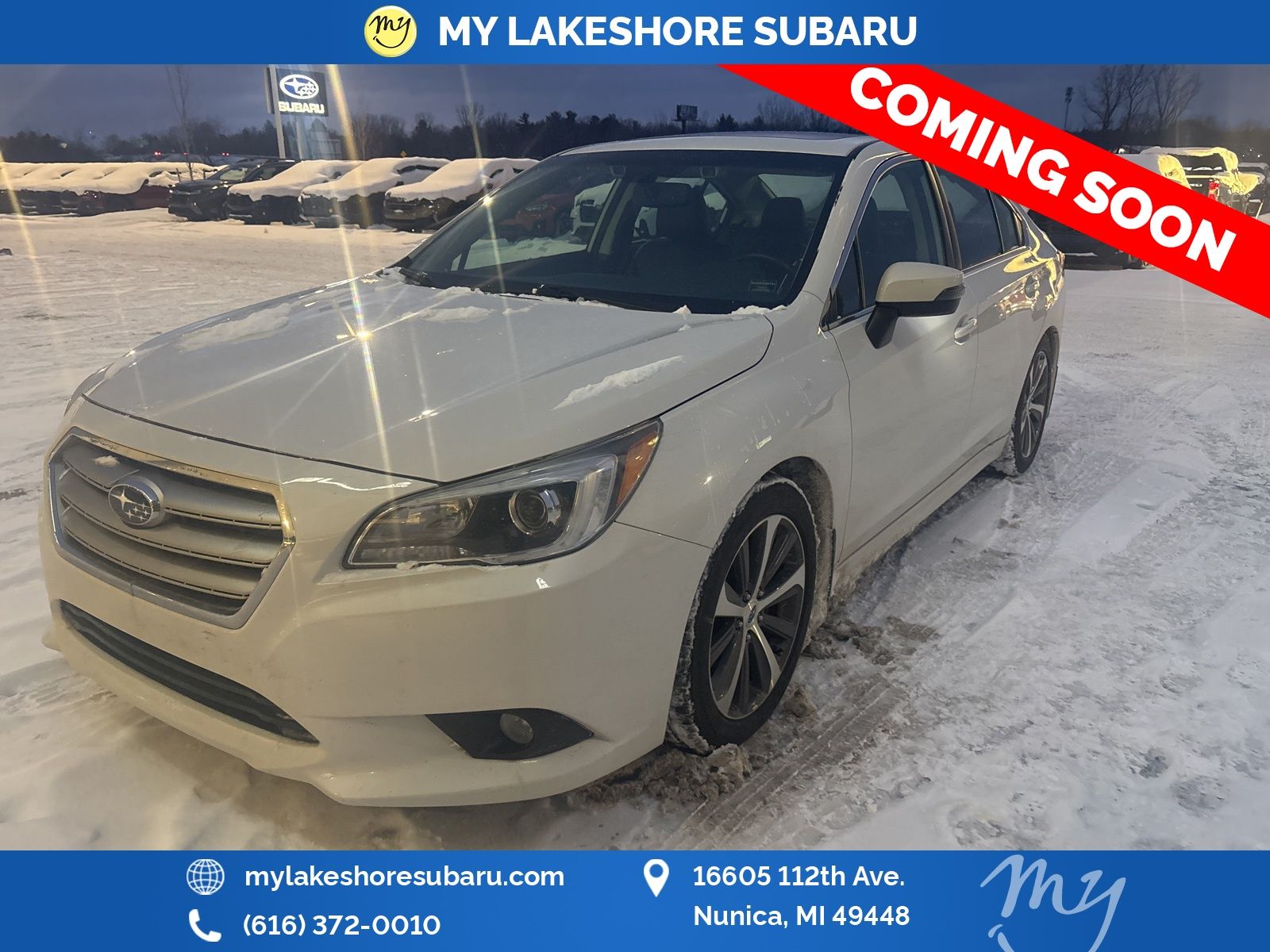 Legacy 2.5i Limited, Crystal White Pearl, all wheel drive, blind spot alert, EyeSight Driver Assist, heated rear seats, lane departure warning, leather heated power seats, moonroof. Crystal White Pearl 2016 Subaru Legacy 2.5i Limited AWD CVT Lineartronic 2.5L 4-Cylinder DOHC 16V. My Lakeshore Subaru is your #1 choice in Michigan to get the best price on used vehicles and best value for your trade. The My Lakeshore Subaru team is ready to provide you with a world-class experience, ensuring that you find the perfect vehicle that fits all your needs. Every vehicle has been through a full safety inspection completed by certified technicians and fully detailed. Recent Arrival! 26/36 City/Highway MPG.