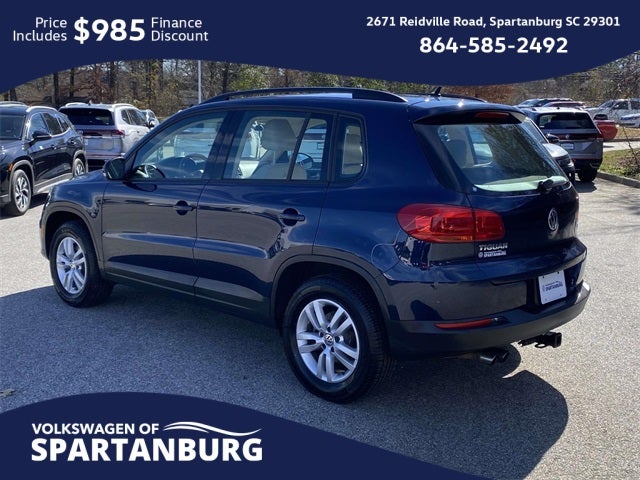 Clean CARFAX. Night Blue 2016 Volkswagen Tiguan S FWD 6-Speed Automatic with Tiptronic 2.0L 4-Cylinder Turbocharged. ABS brakes, Alloy wheels, Compass, Electronic Stability Control, Heated door mirrors, Heated Front Bucket Seats, Heated front seats, Illuminated entry, Low tire pressure warning, Remote keyless entry, Traction control, Trailer Hitch. Welcome to the All-New Volkswagen of Spartanburg! We are excited to introduce our latest lineup of Volkswagen vehicles and quality pre-owned options of all makes and models. At Volkswagen of Spartanburg, we are committed to providing exceptional customer service. Our knowledgeable and friendly sales team is ready to assist you in finding the perfect vehicle that fits both your lifestyle and budget. We are dedicated to ensuring that your car-buying journey is seamless and enjoyable from start to finish. Visit Us Today at Volkswagen of Spartanburg: Come in and see for yourself why we are the leading Volkswagen dealership in the area: 2671 Reidville Rd, Spartanburg, SC 29301 or call us at (864) 585-2492. We look forward to welcoming you and helping you drive away in your dream car! 21/26 City/Highway MPG. Visit Volkswagen of Spartanburg, proudly serving customers from Spartanburg, Greenville, Cherokee, Union, Laurens, and Rutherford counties. We offer flexible financing options to suit your needs. We look forward to helping you drive away in your dream car!