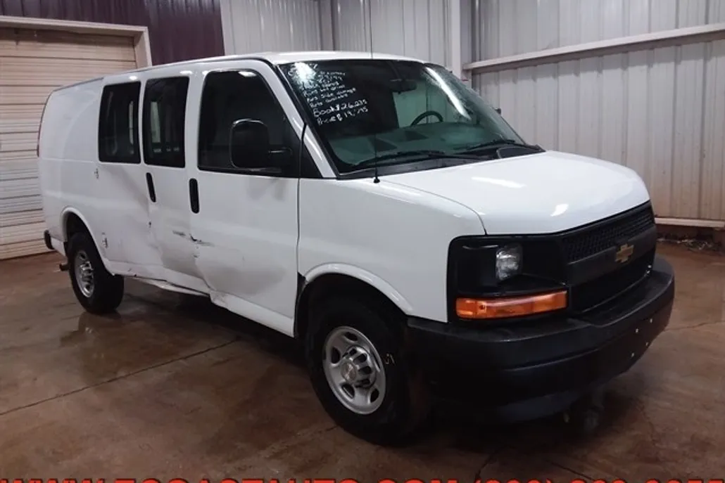 This 2017 Chevrolet Express Cargo Van has been damaged with runs/lot drives and passenger side damage. Parts are available. It features a powerful V8 engine and automatic transmission. The van is in used condition with 59,199 miles.