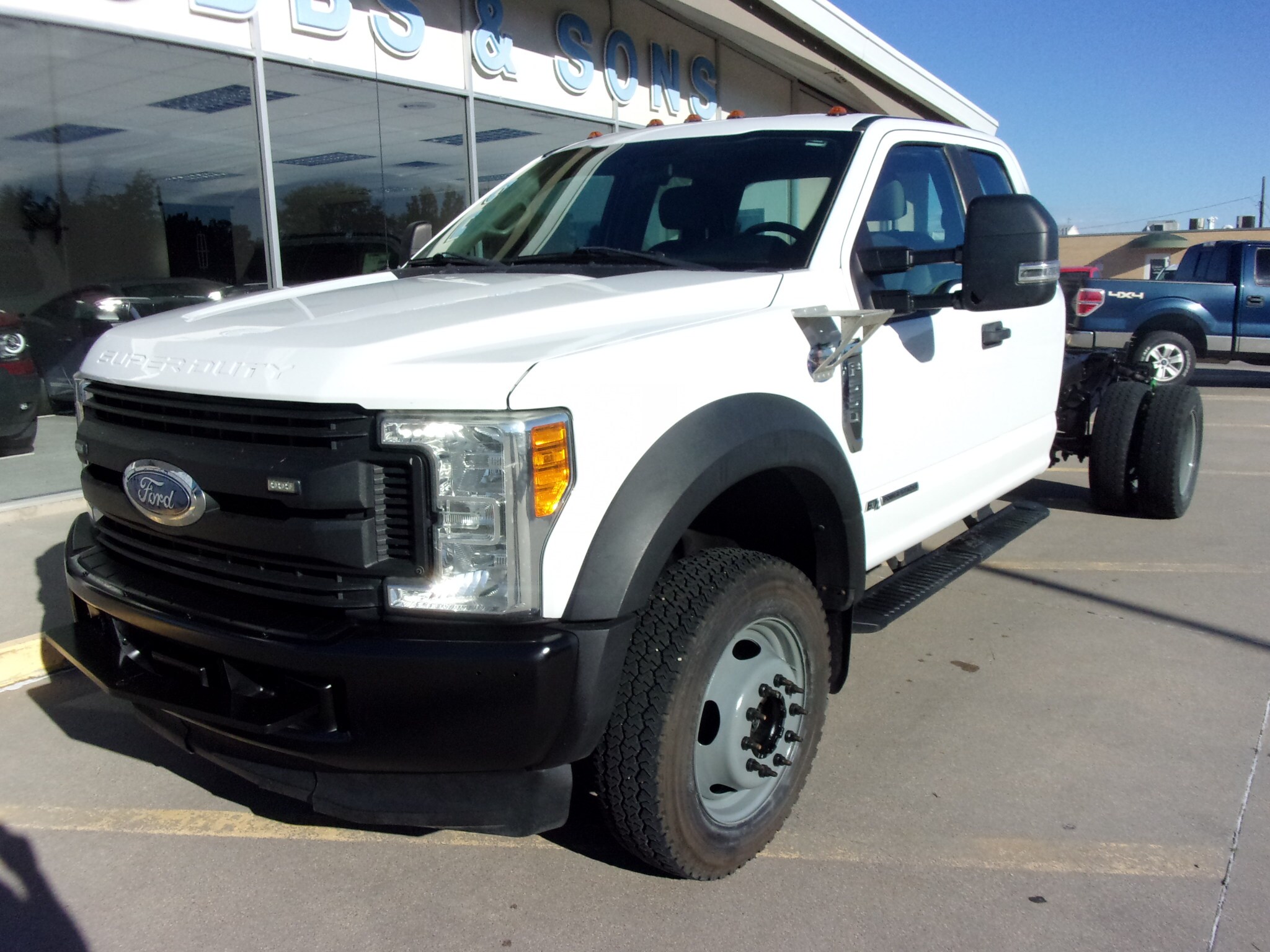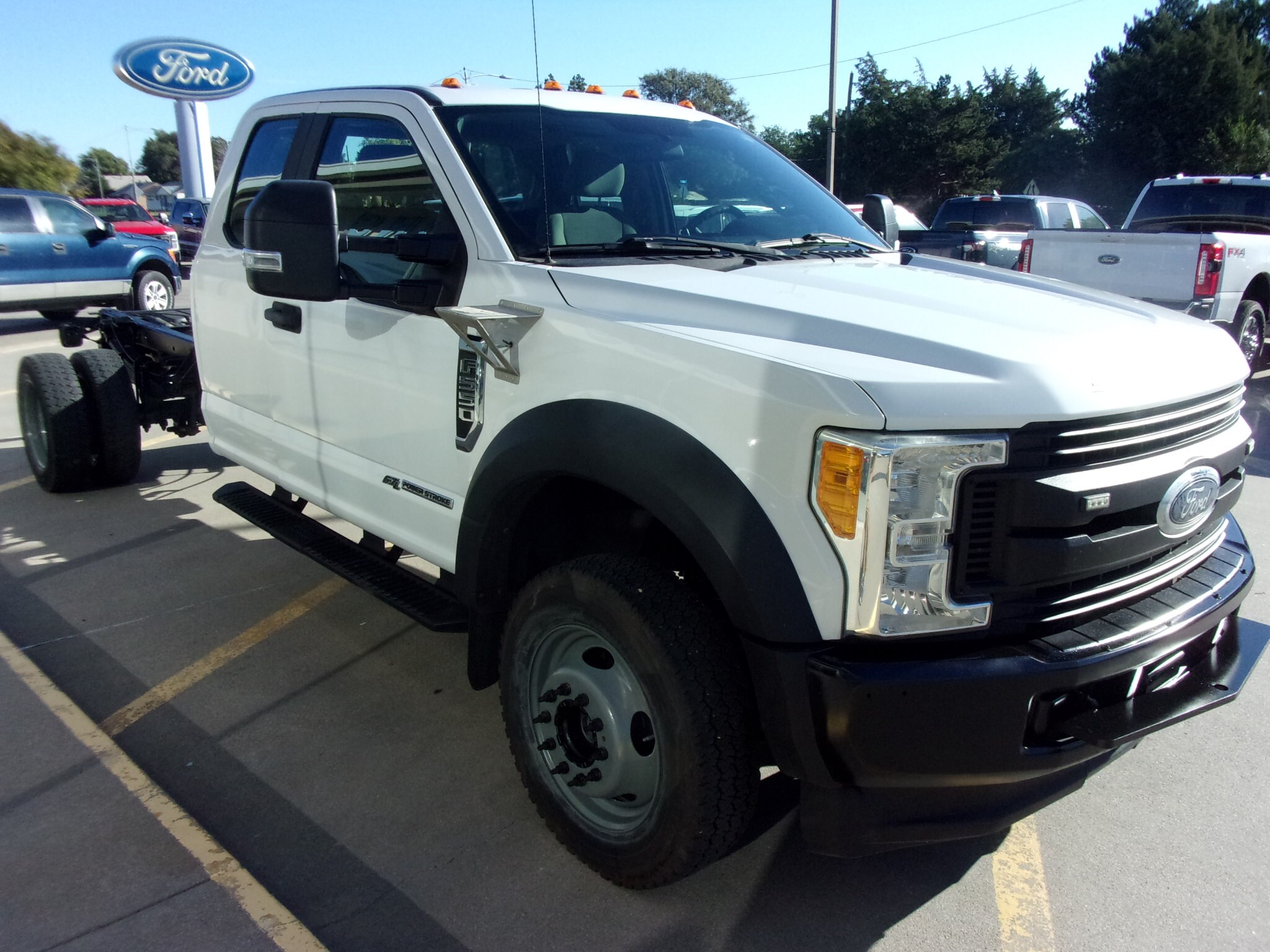 2017 Ford F550 S/C Chassis XL 4X4, Oxford White w/Gray Cloth, 6.7L Diesel, Power Equipment Group, Heated Trailer Tow Mirrors, Trailer Brake Controller, 19,500# GVWR, 40 Gallon Fuel Tank, 192” Wheelbase, 225/70R19.5 Maxtrac Tires, 4.88 Limited Slip, 158K Miles.
