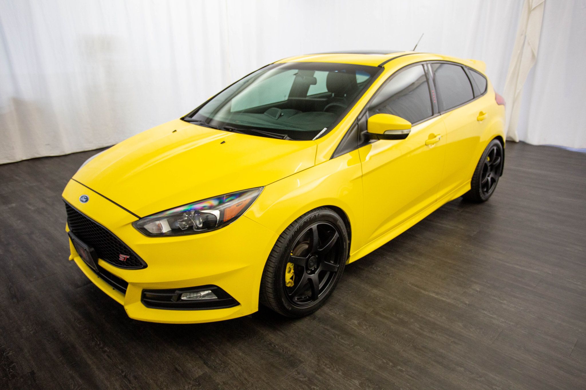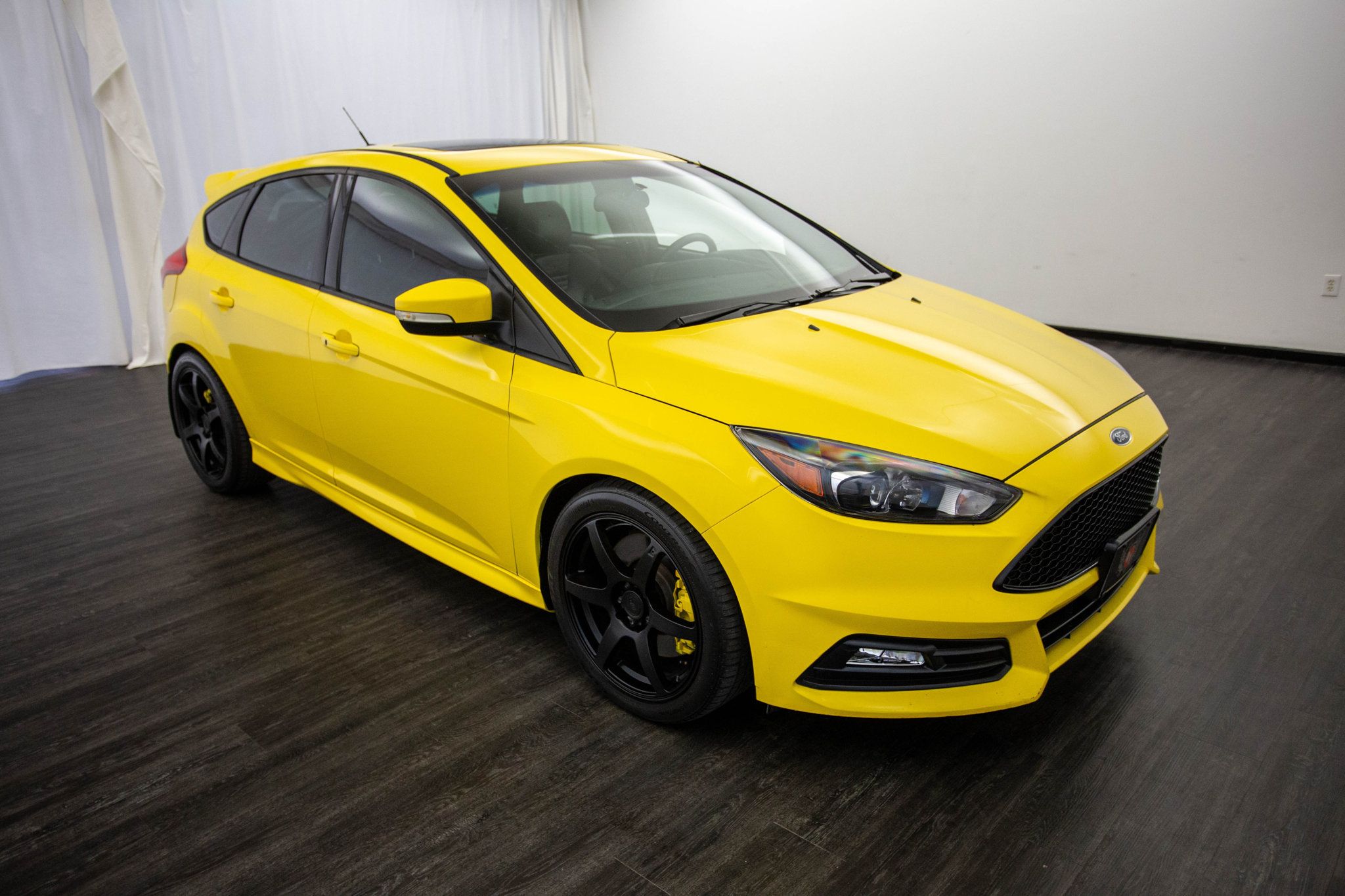2017 Ford Focus ST. Texas owned and finished in head-turning Triple Yellow, this 2017 Ford Focus ST is a true hot hatch that blends everyday usability with serious driver excitement. Under the hood, the turbocharged 2.0L EcoBoost engine paired with a 6-speed manual transmission delivers quick acceleration and an engaging, connected driving experience that enthusiasts love. Its aggressive stance is further enhanced by aftermarket 18" Motegi wheels, giving the car an even more purposeful, performance-driven look. Inside, the black leather interior is both sporty and well appointed, elevated by the desirable 402A equipment group that brings a premium feel to this performance hatch. Dual-zone climate control, heated front seats, a heated steering wheel, ambient interior lighting, and an 8-way power driver seat make it comfortable for daily driving, while bi-xenon headlamps, a power moonroof, and voice-activated navigation add modern convenience and style. Carbon fiber interior accents complete the cabin with a race-inspired touch. Balanced, quick, and loaded with thoughtful upgrades, this Focus ST delivers a driving experience that's just as thrilling on a back road as it is practical for everyday use. Finished in one of the most iconic ST colors and tastefully modified, it's a standout example for drivers who want performance without compromise.