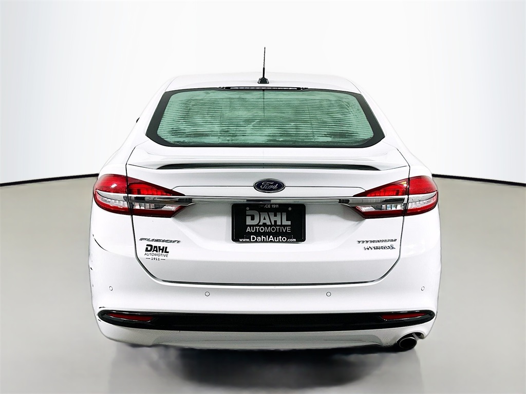 Recent Arrival! 2017 White Platinum Metallic Tri-Coat Ford Fusion Hybrid Titanium FWD Leather Seats, Heated Seats, Blind-Spot Monitors, Lane Keeping Assist, Touchscreen Controls, Backup Camera, Keyless Access with Push Button Start, Automatic Headlights, Android Auto, Apple CarPlay, Bluetooth Hands-Free, Bluetooth, Sunroof/Moonroof, Moonroof. Odometer is 18899 miles below market average! 43/41 City/Highway MPG Choosing a Dahl Used Car Advantage vehicle will give you the confidence your decision is a sound investment. A Dahl UCA vehicle provides you with a 7 month/7,000 mile powertrain limited warranty. A fully comprehensive 169-point inspection conducted by a factory-trained technician. A complete Superior Vehicle Detail. 3-day money back guarantee or 30-day easy exchange option. Plus a complimentary Autocheck vehicle history report. If only all life's decisions were this easy. To ensure that your recently purchased vehicle remains in tip-top condition, we include the first scheduled maintenance appointment with every vehicle purchased.