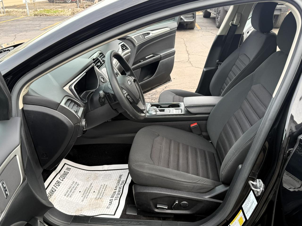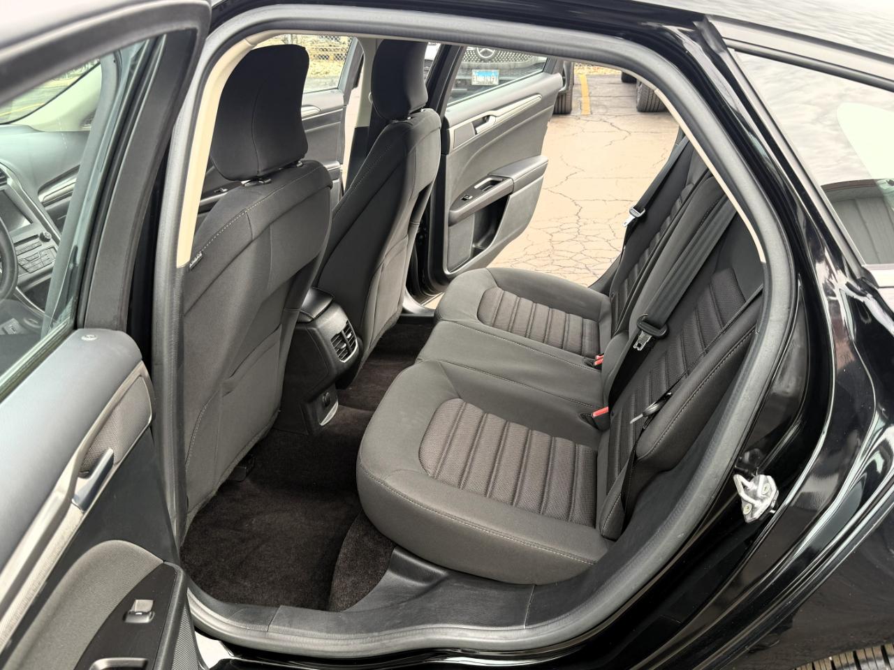 Zoom through the city streets in style with this sleek Black 2017 Ford Fusion! This fun and sporty sedan is perfect for your daily commute with its efficient Front-Wheel Drive and smooth Electric Power-Assist Speed-Sensing Steering. The 3.07 Axle Ratio ensures a quick acceleration while the Gas-Pressurized Shock Absorbers offer a comfortable ride. Inside, you'll find a spacious cabin with high-tech features like the Streaming Audio system and integrated Roof Antenna. The driver and passengers will enjoy the comfortable cloth seats with plenty of legroom, while the 60-40 Folding Bench Rear Seat provides extra storage space when needed. Safety is a top priority with this Ford Fusion, equipped with Dual Stage Front Airbags, Side Impact Beams, and a convenient Back-Up Camera. Plus, the Carfax report is available so you can purchase with confidence knowing the vehicle's history. With its stylish design, efficient performance, and modern features, this 2017 Ford Fusion is the perfect blend of fun and functionality. Don't miss out on the opportunity to take this impressive sedan for a test drive today!