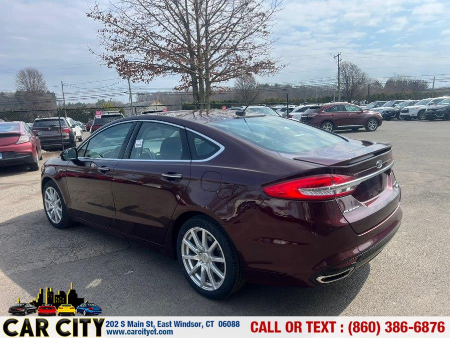 2017 Ford Fusion Titanium FWD, available for sale in East Windsor, Connecticut. Please confirm the accuracy of the specifications provided above with the dealer's representative. Neither the dealer nor the provider of the information is responsible for misprints or other errors regarding this data. Mileage information is based on an EPA rating at the time the vehicle was manufactured. Actual mileage will vary with options, driving conditions, driving habits, and vehicle's condition.