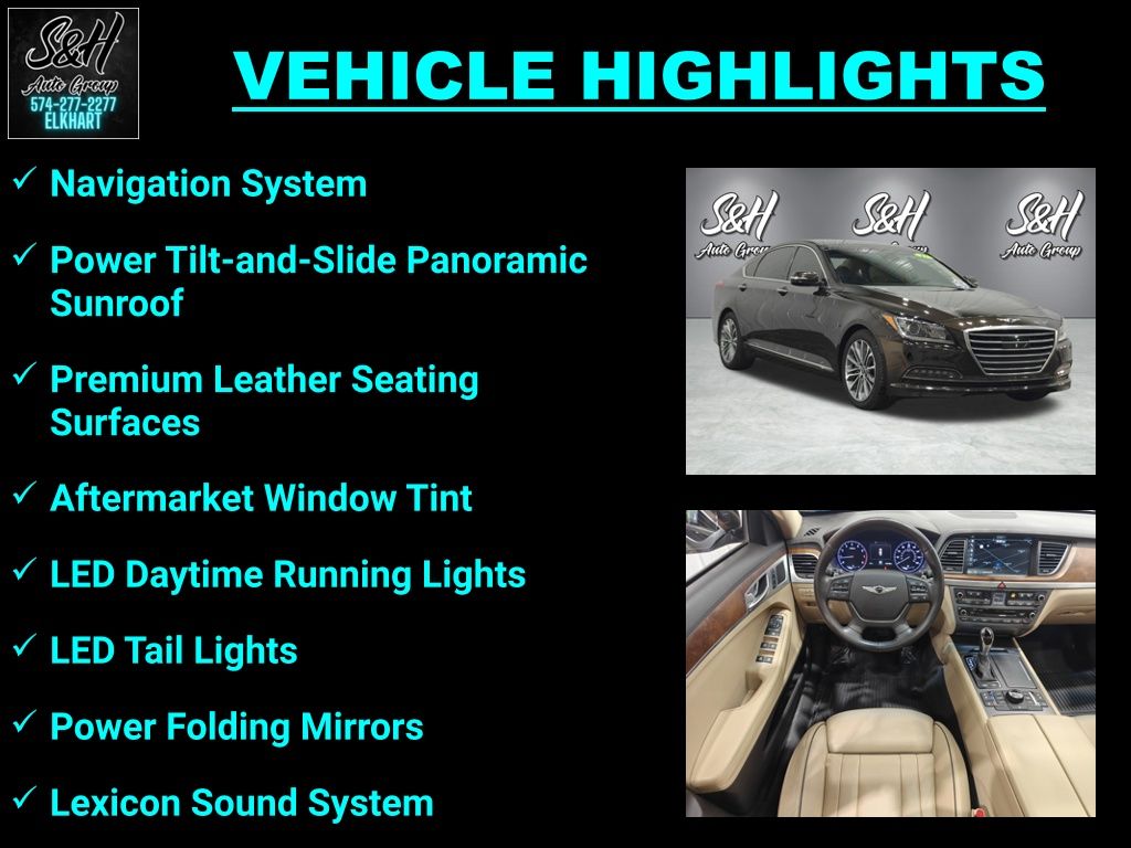 Brown 2017 Genesis G80 3.8 AWD 8-Speed Automatic with SHIFTRONIC 4D Sedan 3.8L V6 DGI DOHC Dual CVVT 16/25 City/Highway MPG. At S & H we pride ourselves on our outstanding customer service, our transparent sales process and our rock bottom prices! Recent Arrival! Enjoy the benefits of certified service near Mishawaka IN, South Bend IN, Niles MI and Edwardsburg MI at the S&H Motor Sales Service Center. If you're anything like us, you love the feeling of driving a preowned car, and you want your car to feel like new for years and years to come. Fortunately, one of the best ways to ensure that, and avoid costly repairs in the future is to keep up with your manufacturer-recommended maintenance. And with years of preowned service expertise under our belts here at S&H Motor Sales, there's no one better equipped to serve your car care needs than we are.