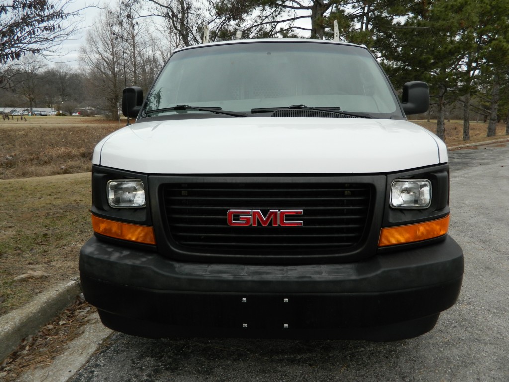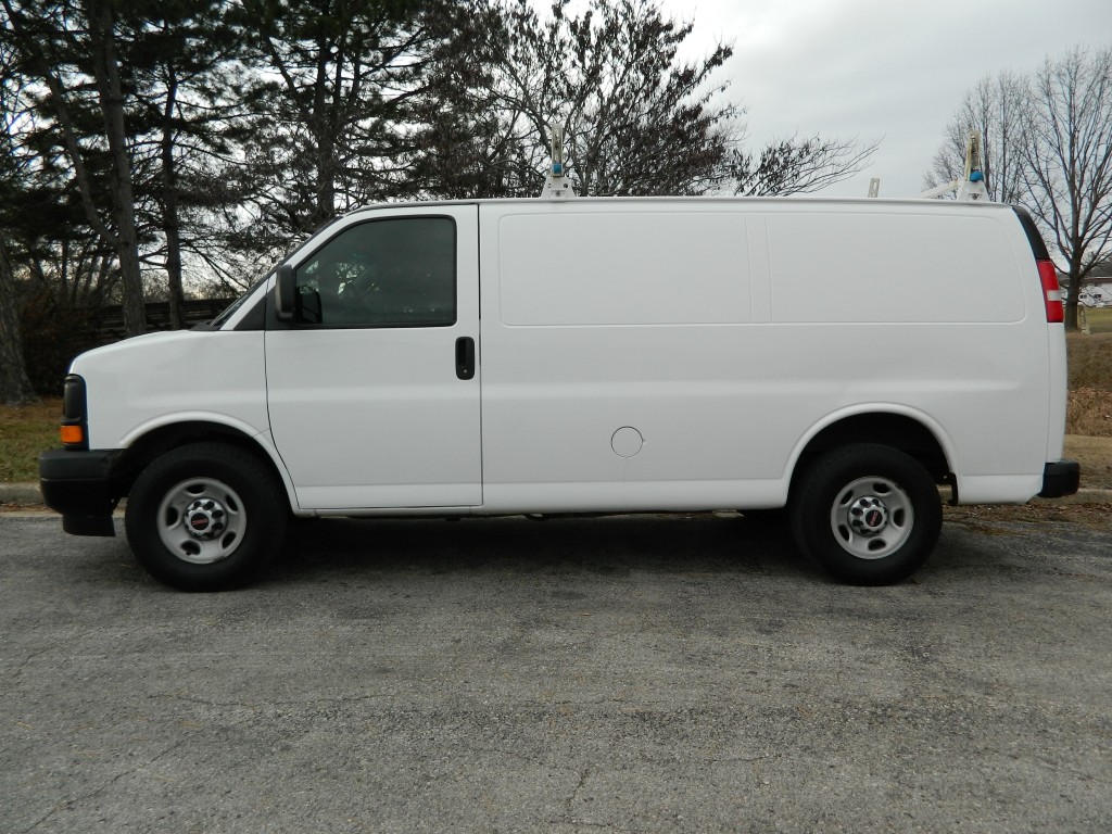 2017 GMC Savana 2500 Cargo Van with HVAC service shelving and a ladder rack on top. This is a one-owner corporate van. It has the Vortec 4.8L V8 engine with 285hp and 295ft lbs of torque, 6-Speed Automatic Transmission (HMD 6L-90) with tow/haul and manual shift modes, rear wheel drive with traction control, a 3.42 axle ratio, steel wheels and a good set of tires. White with black trim, glass on the rear and passenger-side cargo doors, overhead rack. Cargo area has black vinyl flooring, Adrian Steel shelving and bottle rack for HVAC service, and a steel divider protecting the passengers. Passenger area has black vinyl flooring, gray cloth seats, seating for two, power windows and door locks, manual mirrors, good heat and cold A/C, 150 Watt power inverter, sound system with AM/FM/USB inputs, cruise control and more.