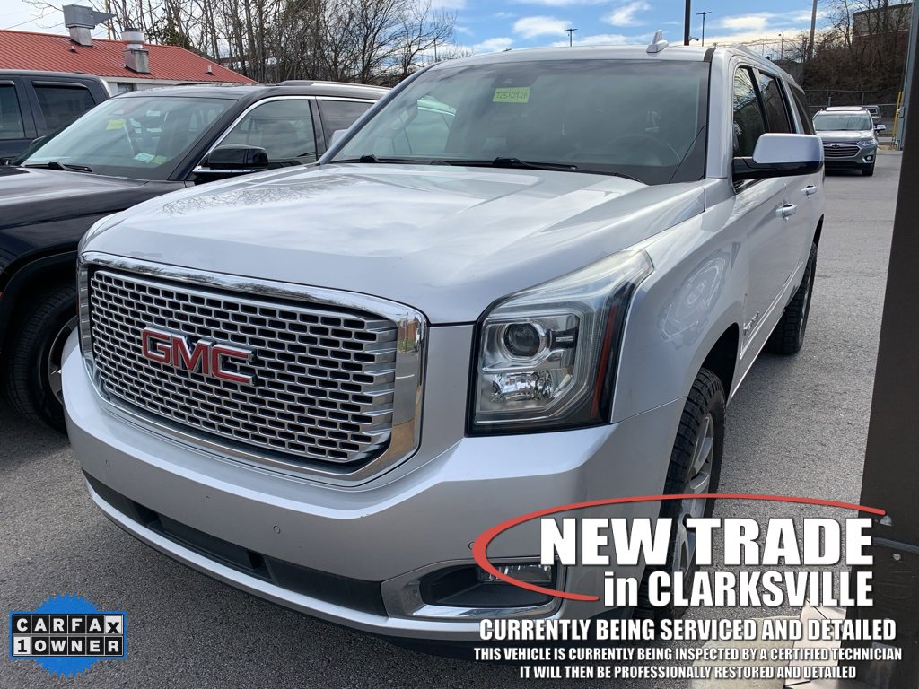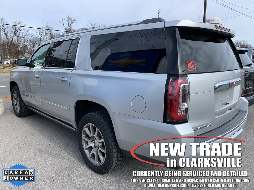 CARFAX One-Owner. Clean CARFAX. Quicksilver Metallic 2017 GMC Yukon XL DenaliThe Pre-Owned 2017 GMC Yukon XL Denali with EcoTec3 6.2L V8 at Serra Clarksville. Well equipped: Enhanced Driver Alert Package (Forward Collision Alert Sensor Indicator, Intellibeam Automatic High Beam On/Off Headlamps, Lane Keep Assist, and Low Speed Forward Automatic Braking), License Plate Front Mounting Package, Magnetic Ride Control Suspension Package, Memory Package, Open Road Package (3rd Row DVD Screen, Power Tilt-Sliding Sunroof w/Express-Open/Close, and Rear Seat Blu-Ray/DVD Entertainment System), Preferred Equipment Group 5SA (17 Disc/Disc VAC Power Brakes, 5 Auxiliary 12-volt Power Outlets, Black Assist Steps w/Chrome Strip, Hands Free Power Liftgate, Heated Leather-Wrapped Steering Wheel, Inside Rear-View Auto-Dimming Mirror, Integrated Trailer Brake Controller, OnStar Basic Plan For 5 Years, OnStar w/4G LTE, Passive Entry System, Power Release Second Row Bucket Seats, Power Tilt & Telescopic Steering Column, Power-Adjustable Pedals For Accelerator & Brake, Push Button Keyless Start, Rear Cross-Traffic Alert, Remote Keyless Entry, Side Blind Zone Alert w/Lane Change Alert, Universal Home Remote, and Wireless Charging), 4WD, 10 Speakers, 3.23 Axle Ratio, 3rd row seats: split-bench, 4-Wheel Disc Brakes, ABS brakes, Adaptive suspension, Adjustable pedals, Air Conditioning, Alloy wheels, AM/FM radio: SiriusXM, Apple CarPlay/Android Auto, Auto High-beam Headlights, Auto-dimming door mirrors, Auto-dimming Rear-View mirror, Automatic temperature control, Bodyside moldings, Bose Centerpoint Premium 10-Speaker Surround Sound, Brake assist, Bumpers: body-color, CD Player, CD player, Compass, Delay-off headlights, Driver door bin, Driver vanity mirror, Dual front impact airbags, Dual front side impact airbags, Electronic Stability Control, Emergency communication system: OnStar Guidance, Exterior Parking Camera Rear, Front anti-roll bar, Front Bucket Seats, Front Center Armrest, Front dual zone A/C, Front fog lights, Front reading lights, Front wheel independent suspension, Full-Feature Reclining Bucket Seats, Fully automatic headlights, Garage door transmitter, Genuine wood console insert, Genuine wood dashboard insert, Genuine wood door panel insert, Heads-Up Display, Heated & Ventilated Driver & Front Passenger Seats, Heated door mirrors, Heated front seats, Heated rear seats, Heated steering wheel, High-Intensity Discharge Headlights, Illuminated entry, Leather Shift Knob, Low tire pressure warning, Memory seat, Navigation System, NavTraffic, Occupant sensing airbag, Outside temperature display, Overhead airbag, Overhead console, Panic alarm, Passenger door bin, Passenger vanity mirror, Pedal memory, Perforated Leather-Appointed Seat Trim, Power door mirrors, Power driver seat, Power Liftgate, Power passenger seat, Power steering, Power windows, Premium audio system: IntelliLink, Pwr Retractable Assist Steps w/Perimeter Lighting,