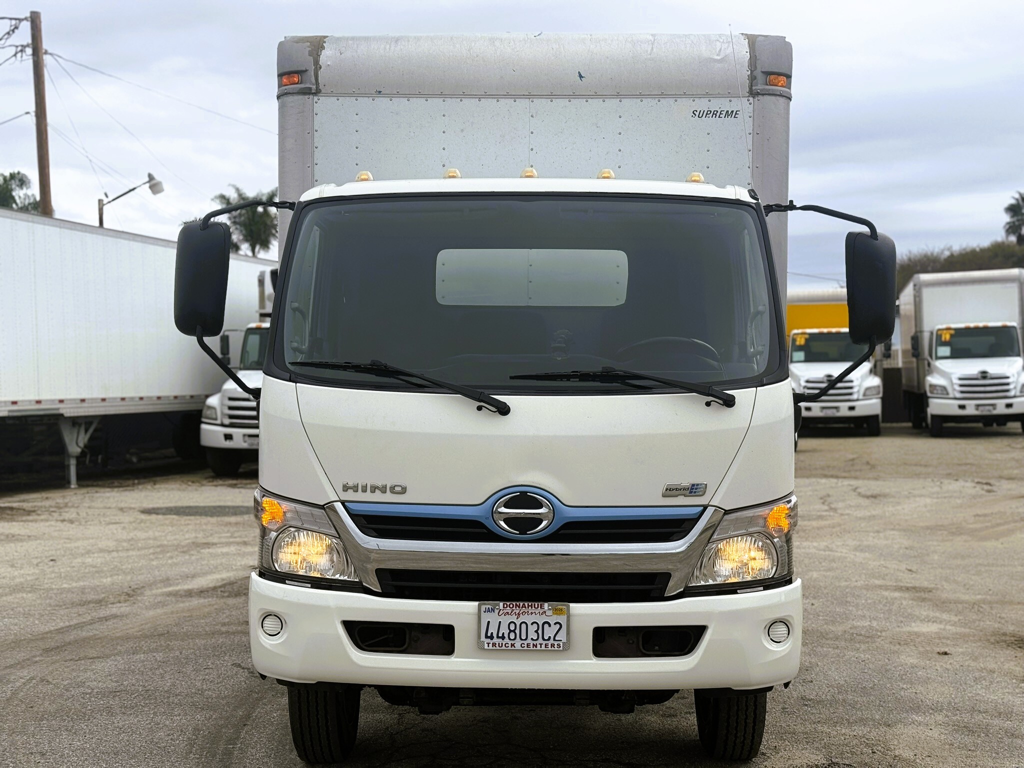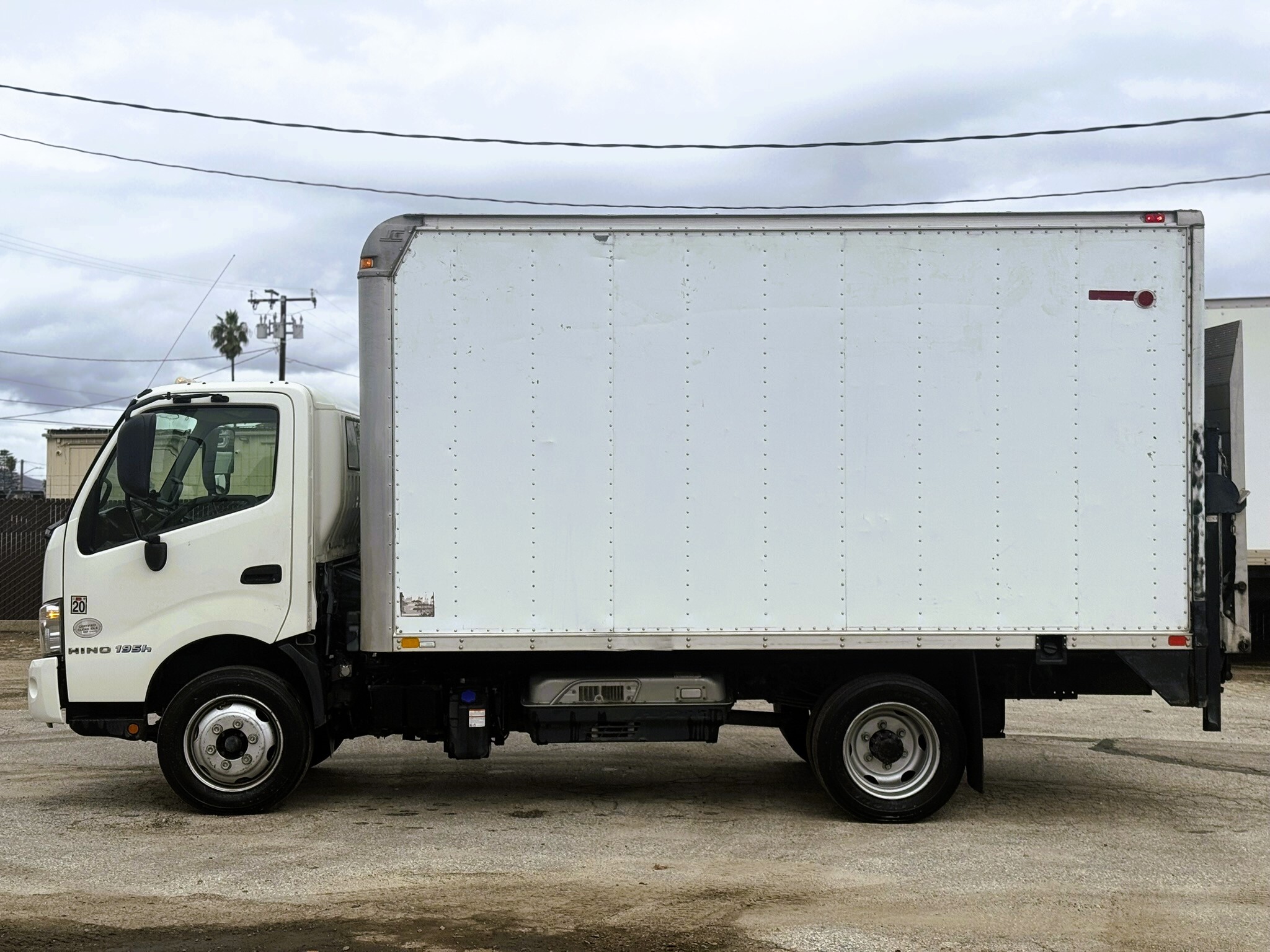 This 2017 Hino 195H (Stock #HK001267) is a pre-owned box truck currently in stock in Ventura. It is powered by an Aisin A465 6-speed transmission and features a 138-inch wheelbase with a 110-inch cab-to-axle measurement. The truck is equipped with a 14-foot Supreme body measuring 90 inches wide and 85 inches high. A Tommy Gate liftgate rated at 2,000 lbs. (910 kg) is installed, with an 89-inch-wide and 68.35-inch-long platform for efficient loading. This unit has approximately 222,500 miles and a GVWR of 19,500 lbs. Please note that the rear door shows visible wear and tear from the exterior, consistent with regular use.